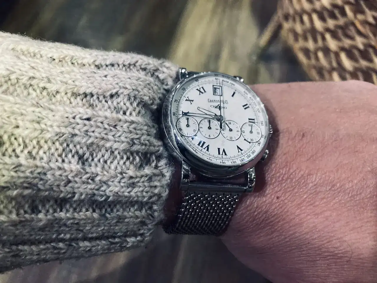 Y como una colección que se valga, por muy grande que sea, no es nada sin un crono automático, le llegó la hora a otro de mis amores de siempre. Eberhard & Co. Chrono 4 Bellissimo. No me gustan demasiado los cronos, pero éste es especial, irresistible. Y hay modelos con una imagen más moderna, pero el Bellissimo fue el primero en el que yo me fijé, y el que quería tener en mi colección. Esos números romanos con las 4 subesferas en fila creo que son lo más bonito que jamás he visto en un reloj. Y poder tenerlo en tu muñeca y disfrutarlo en directo, es algo de lo que te quedas sin palabras. Desde que le puse una milanesa, lo disfruto más a menudo.