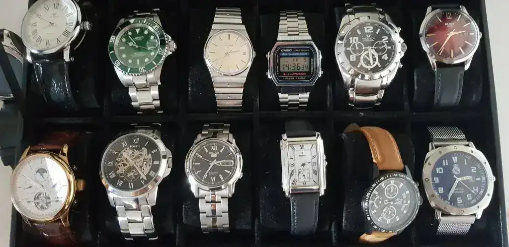 Está organizada de la siguiente manera: los automáticos a la izquierda, los de cuarzo a la derecha. La frontera, entre los dos Seiko. Dentro de los cuarzo, los tengo organizados de esta manera: en primer lugar los japoneses con maquinaria japonesa, luego los españoles con maquinaria japonesa, luego el inglés con maquinaria japonesa, y finalmente el reloj del Real Madrid, del cual desconozco cualquier información. En el lado de los automáticos en la esquina los chinos con maquinaria china, luego el estadounidense con maquinaria china, y finalmente el japonés con maquinaria japonesa.