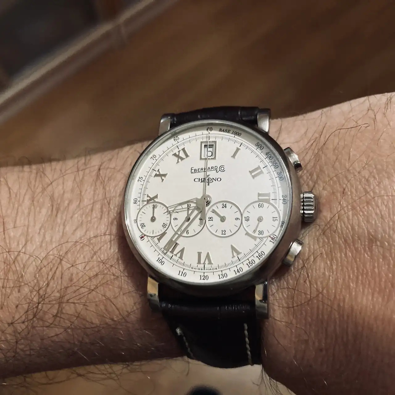 Y como una colección que se valga, por muy grande que sea, no es nada sin un crono automático, le llegó la hora a otro de mis amores de siempre. Eberhard & Co. Chrono 4 Bellissimo. No me gustan demasiado los cronos, pero éste es especial, irresistible. Y hay modelos con una imagen más moderna, pero el Bellissimo fue el primero en el que yo me fijé, y el que quería tener en mi colección. Esos números romanos con las 4 subesferas en fila creo que son lo más bonito que jamás he visto en un reloj. Y poder tenerlo en tu muñeca y disfrutarlo en directo, es algo de lo que te quedas sin palabras. Desde que le puse una milanesa, lo disfruto más a menudo.