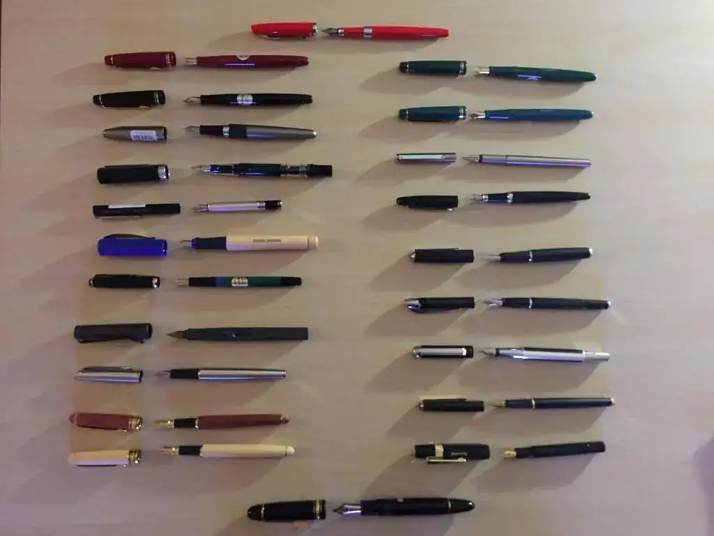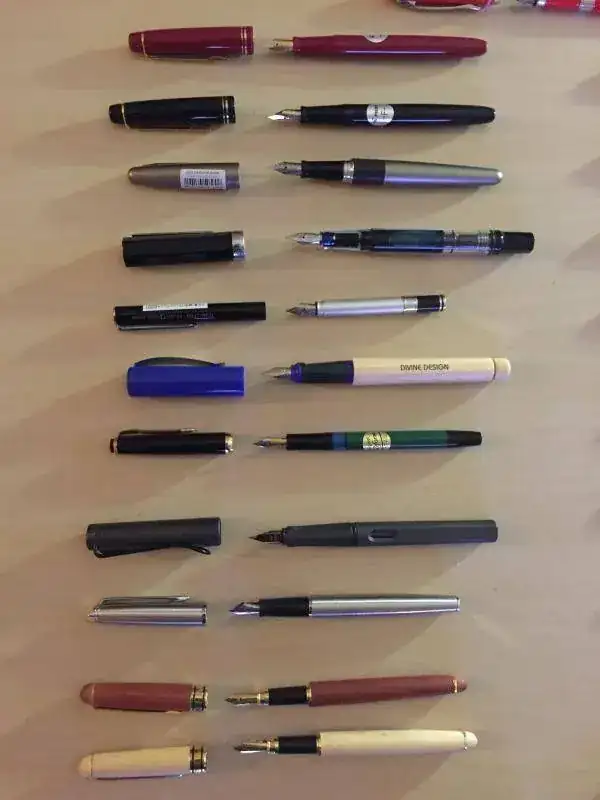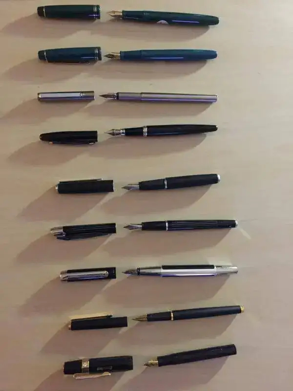 Por ahora vais bien, dos nisu de madera, de esas de 1€,jajaj, 4 inoxcrom, meisterstuck 149,, la pilot 78g en 4 colores, MB noblese, kaweco sport, pilot urban, lamy safary, "la dovine resign" no, esa no está, de hecho dime cual cres que es y te digo modelo.