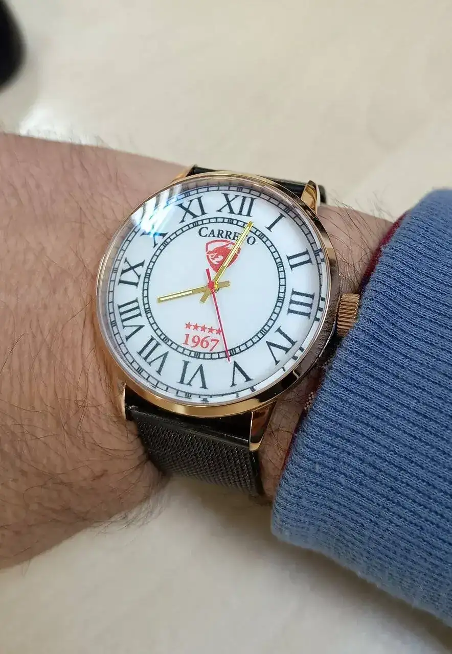 Caja y corona de un Pagani que se fue al traste. Correa milanesa negra de un Lotus. Movimiento, si se le puede llamar así, un cuarzo de un reloj del bazar chino de mi barrio. Esfera (aquí viene lo rudimentario de verdad). Hecha en Word, con mi nick, mi año de nacimiento y un escudo de un dragón que me gustó. Impresa en un folio y plastificada con un gramaje alto de 125 para que quede rígida. Agujas, del mismo reloj del bazar y pintando el segundero de rojo. Todo montado y el resultado es éste: