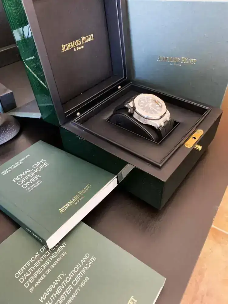 Y como hay libertad de expresión, pienso y digo que aún poniendo unas fotos (supuestamente suyas de un AP diver con documentación), sigo teniendo dudas, por el aspecto del caucho, el grabado AP de la correa (tipografía estrecha), el cepillado del bisel, el encaje de los tornillos, y por la distribución de cuadrícula del dial.