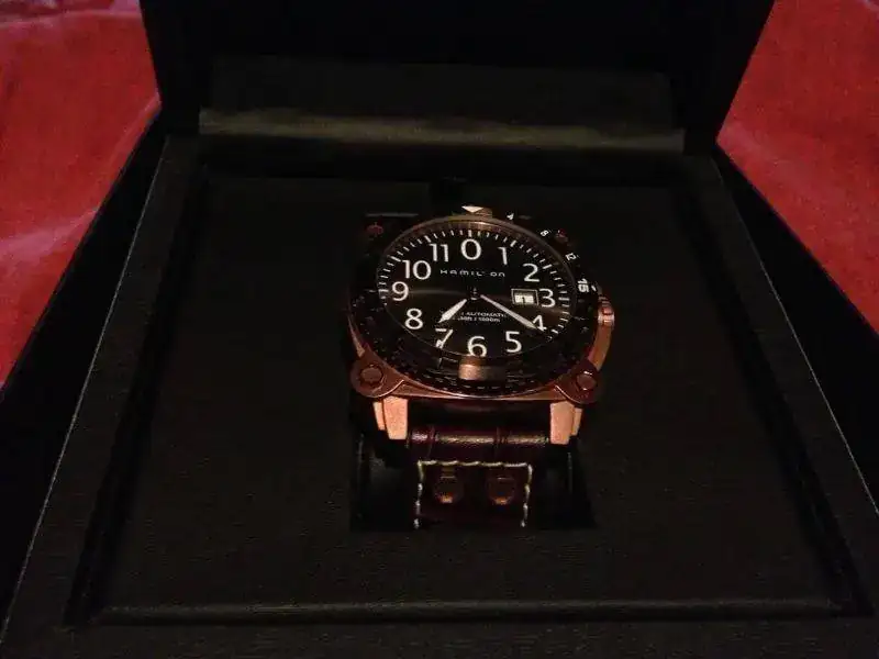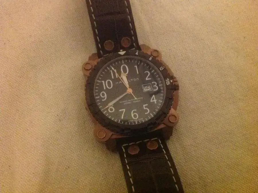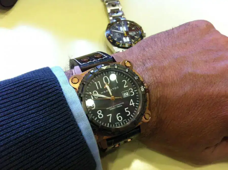 Me la jugué porque volví a adquirir un reloj solo viéndolo en fotografías. Pero esta vez me ha salido bien. Este Hamilton Belowzero 1000m. Con sus +46mm. de caja, esos "tornillos" a la vista y esos 192gr. de peso, lo hacen un reloj contundente.