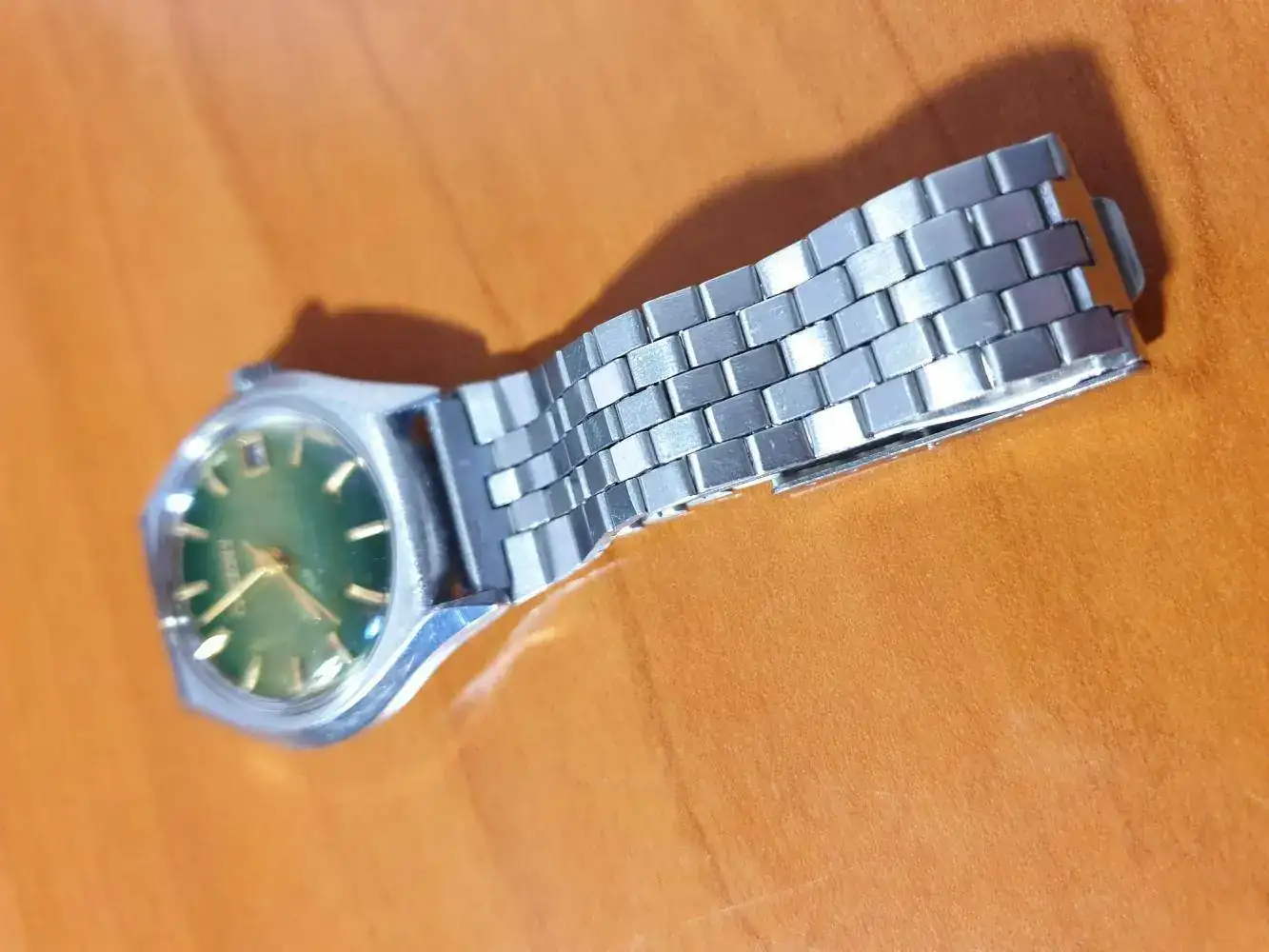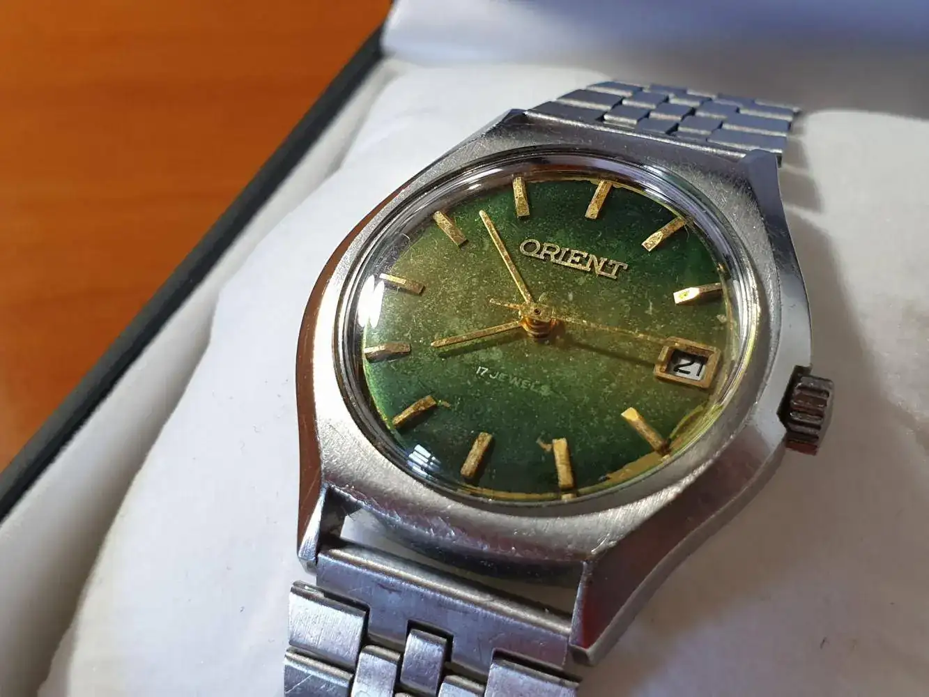 No sé si aprecia en las fotos, pero tiene un color verde amarillento que varía un poco dependiendo de cómo incida la luz. También se le nota el desgaste, sobre todo en la inscripción '17 jewels', un poco borrosa.