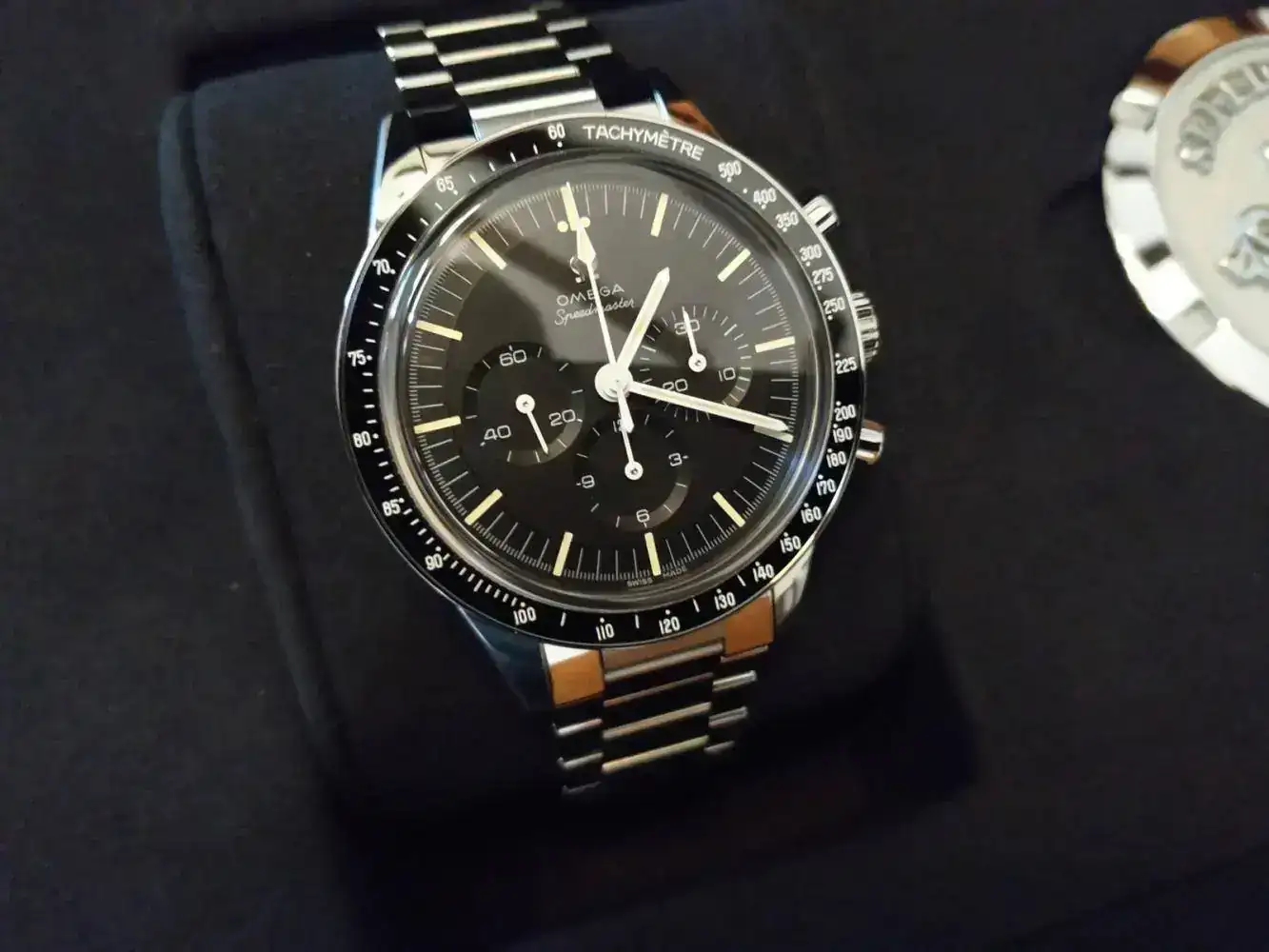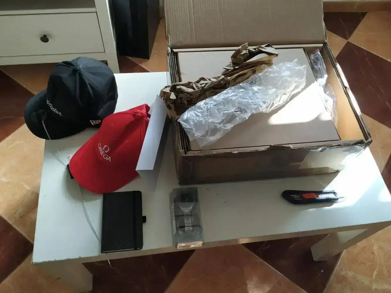 Aqui el primer despliegue, tengo que decir una cosa que no me gustó mucho, y es que al abrir la caja de cartón inmensa, vienen varias cosas aparte de la caja negra del speedmaster y una de ellas es el propio reloj en una funda de plástico...