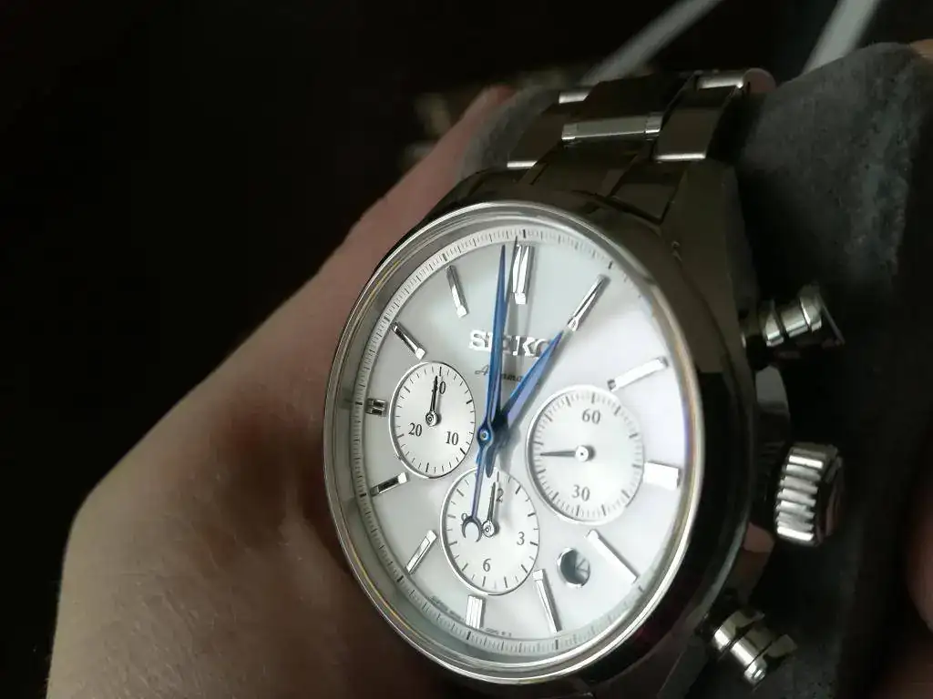 El más reciente de mi colección y posiblemente el mejor acabado de todos: Seiko Cronógrafo automático. Poco común, elegante y luminoso.