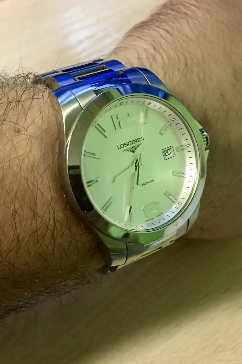 Barajé multitud de opciones (Certina, Orient, Seiko..) pero finalmente me decanté por un Longines Conquest en cuarzo, reloj que me encantó desde el primer momento, pero que desafortunadamente era muy grande para mi gusto. Algo que no supe apreciar hasta haberlo utilizado por unas semanas y el motivo por el que a día de hoy no me llaman la atención relojes de vestir por encima de los 36mm.