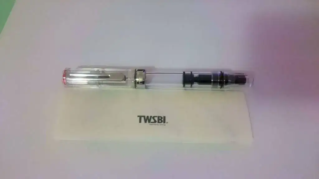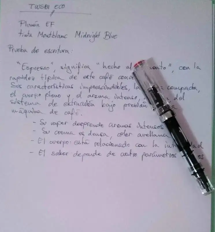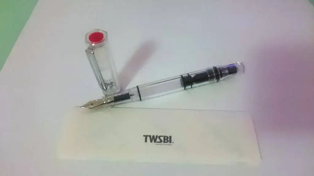 el pasado jueves me llegó mi primera TWSBI, modelo ECO Clear, con plumín EF. Es mi primera demonstrator y estoy encantado con ella. Había leído buenas reseñas de esta marca y me he decidido a comprar una. Tanto el producto, como la presentación, en caja de plástico con su herramienta para aflojar sus partes y la silicona para engrasar el émbolo me han sorprendido. La compré en Amazon y la he recibido directamente de Italia, de una tienda romana llamada Stilo e Stile.