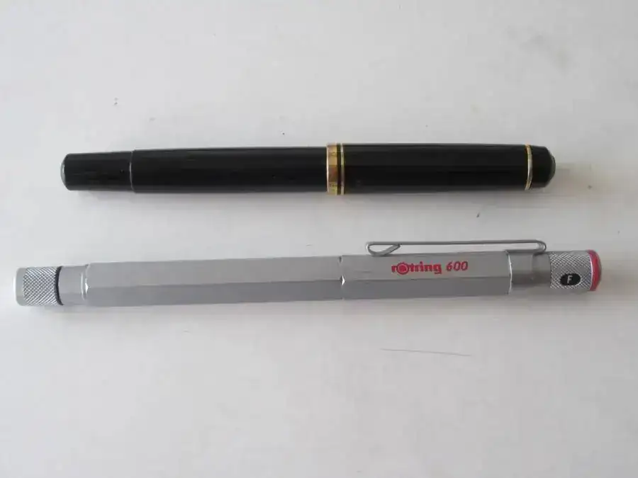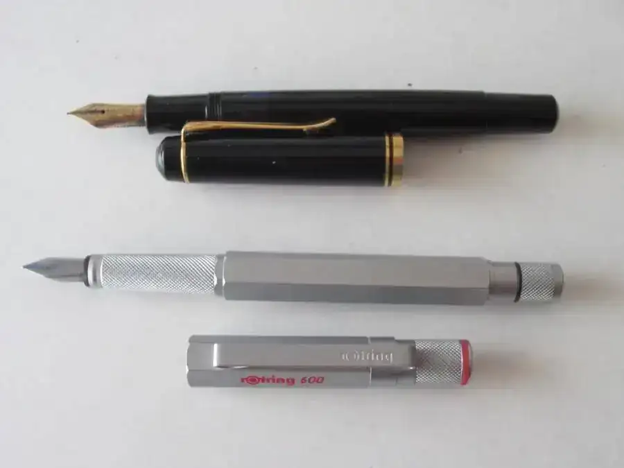 Decir que las utilizo habitualmente, mas la Pelikan que se me hace mas versátil, fiable y, evidente, con mas capacidad de carga de tinta, mientras la rotring tiene un trazo mas grueso y es mas armatoste aún con capuchón quitado.
