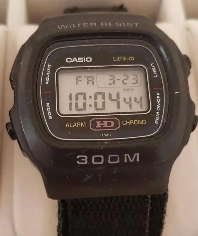 La primera compra con el sueldo del típico trabajo de verano. Lo cierto es que me encanta el reloj y su unión entre el reloj y el armis me recuerda enormemente al de mi querido Casio. Fue mi reloj predominante durante la universidad y aunque a día de hoy me cuesta mas el mantener la estanqueidad que el propio reloj, sigo pasando por caja, pues me gusta usarlo en la playa o la piscina.