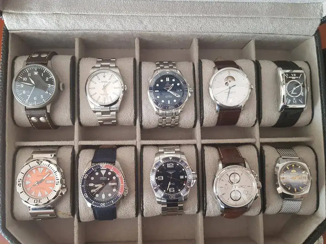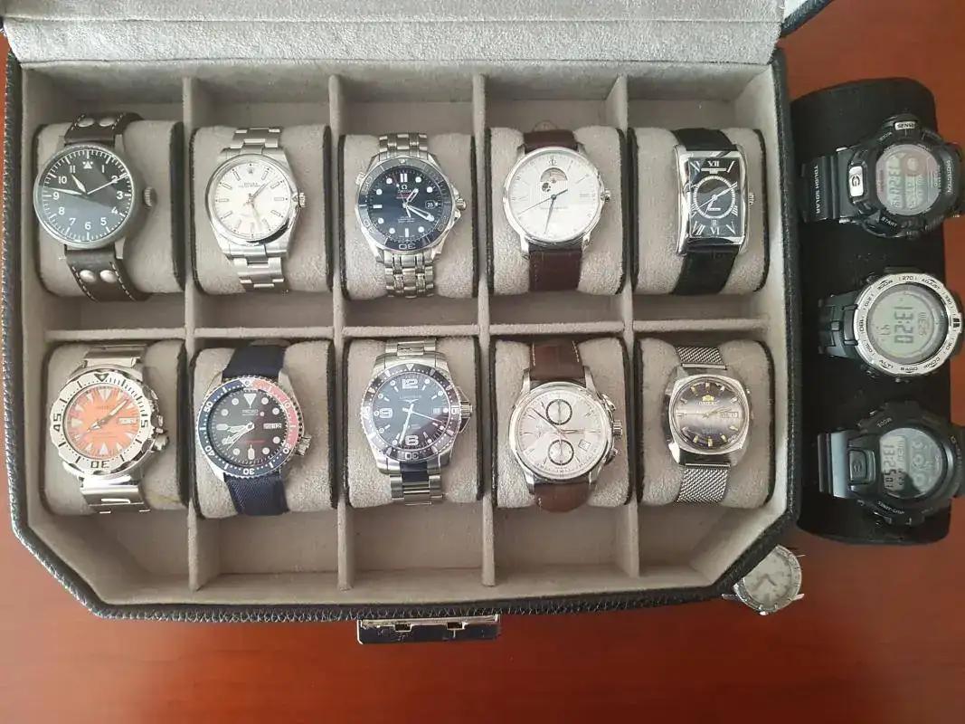 En total, son 10 automáticos, en una caja, entre los que hay varios divers, un crono, un flieger un vintage y otros de vestir, así como dos casios y el de la comunión.