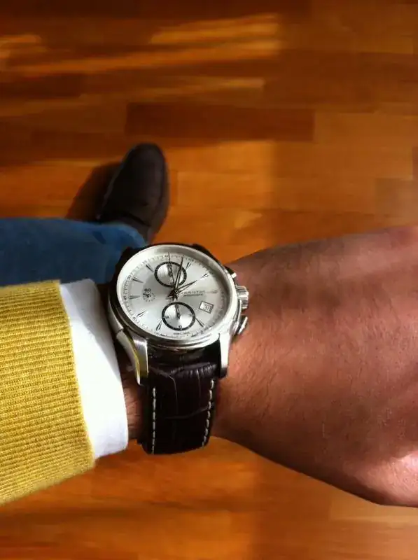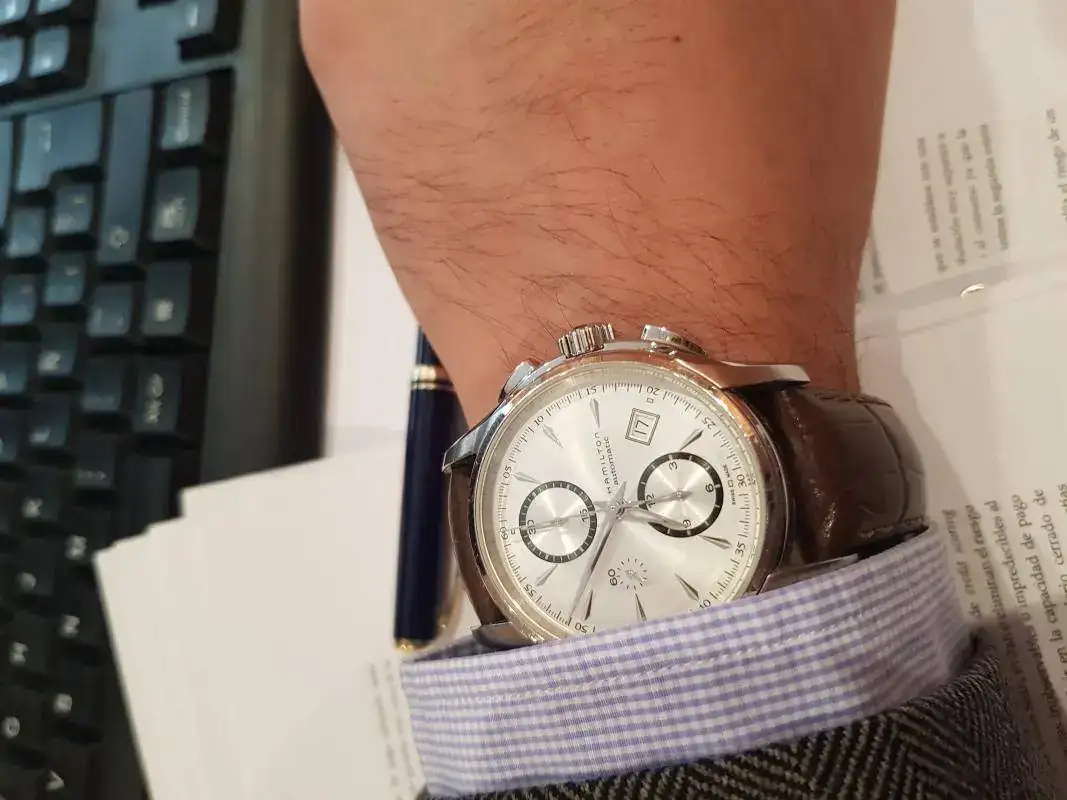 El siguiente fue el Hamilton Jazzmaster Auto chrono. Comprado a un mercante del foro en 2011 si mal no recuerdo. Este Hamilton fue durante años mi reloj para los fines de semana. Me encantaba (y encanta) su diseño elegante y deportivo a la vez, sus acabados para el precio que tenía y la sensación de notar el calibre 7750 en la muñeca dando vueltas cuando lo llevo puesto. Como pegas, su grosor, peso y tamaño para mi muñeca de 16,5 cms. Me resulta algo aparatoso y noto demasiado que lo llevo puesto, por lo que no es de los que más sale.