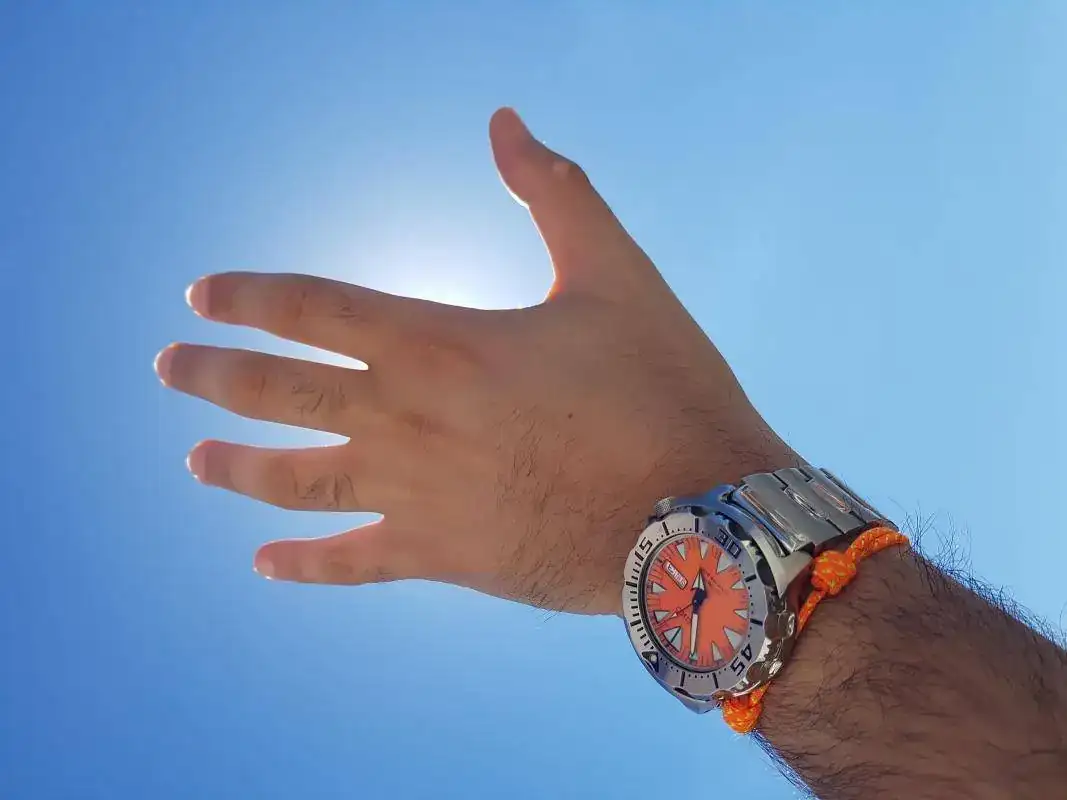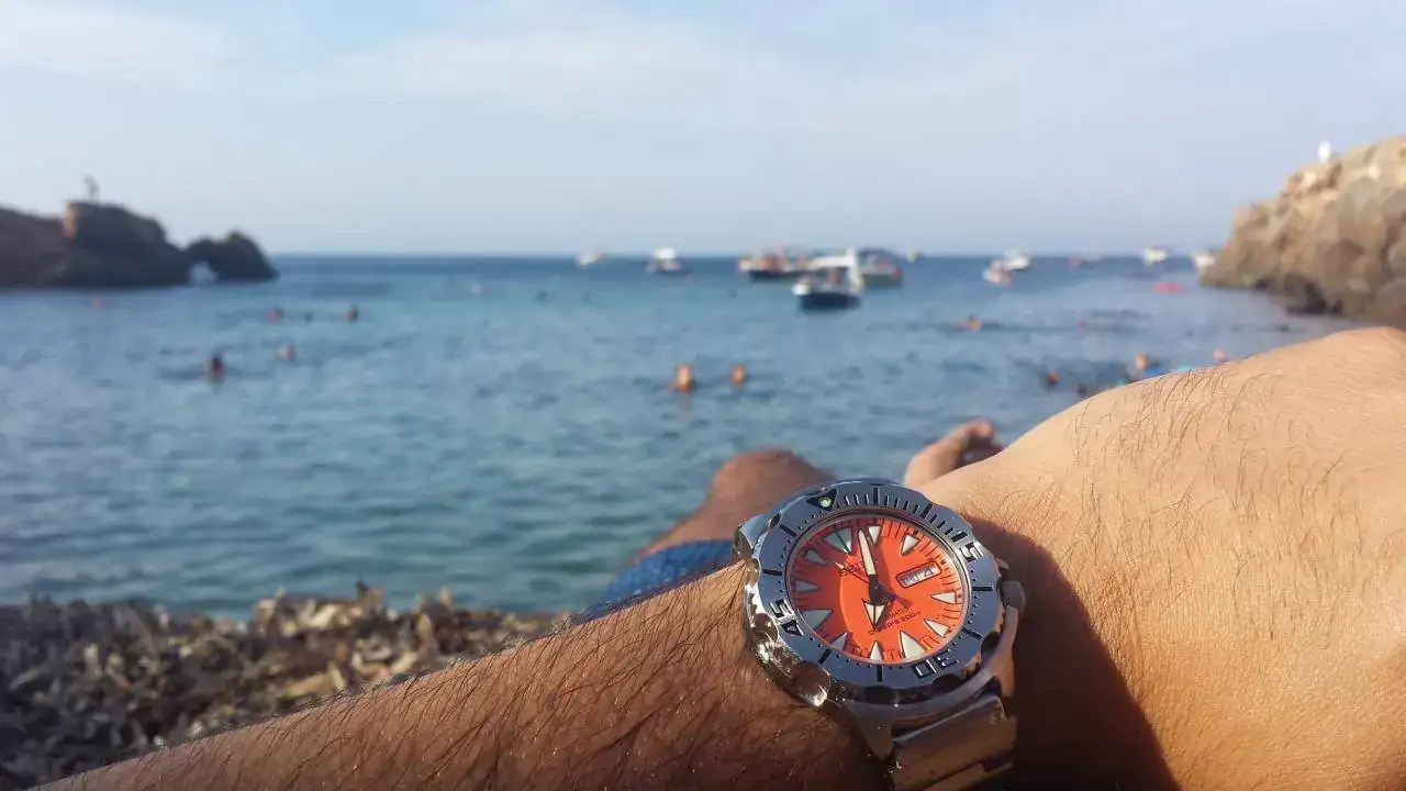 Maravillado por los Seiko, puse mi objetivo en otro “must have” de aquellos años y de ahora, el seiko monster. Fue mi primera compra en el fcv de segunda mano, ya que se veían muchos más que hoy en día y a un precio mucho menor. Por darle color a la creciente caja, me decidí por el naranja, sabiendo que prácticamente solo lo utilizaría en verano para playa y piscina como así sucede, pues su color y diseño lo limitan y hacen que canse más si se utilizase largas temporadas. En vacaciones es el claro protagonista para usar sin preocuparte en la playa. Tuve el de primera generación y años más tarde, lo cambié por de segunda “made in Japan” que tengo ahora, cuyo calibre es significativamente superior.
