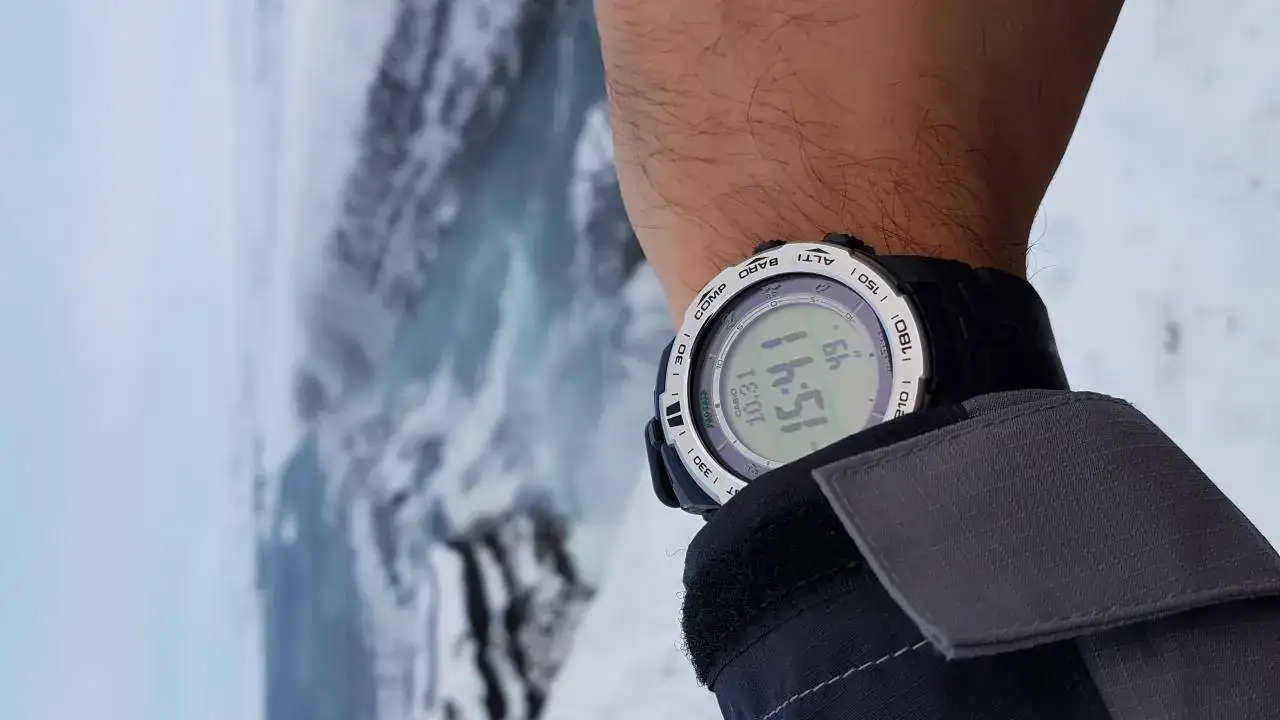 El último en llegar, no es G, pero si un primo hermano, el Casio Protrek PRW 3100. Tiene un par de años y es el que se viene a todas las rutas de senderismo y escapadas a la naturaleza. Tuve antes el PRW 3000, pero cuando salió el 3100 me gustó mucho más, por su bisel de acero. Es un Protrek de tamaño comedido por lo que resulta muy cómodo y ligero, cuenta con tecnología triple sensor, que incorpora altímetro, barómetro, termómetro y brújula lo que lo hace muy entretenido para troquetear y probar sus funciones. Creo que si solo pudiera tener uno digital, me quedaría con ese.