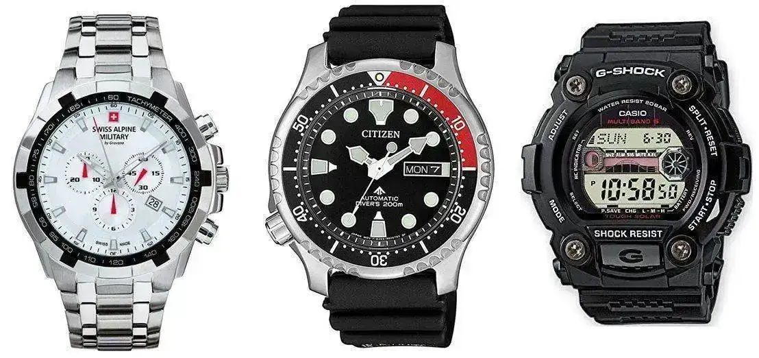 - Queremos tres relojes: uno de diario, uno de ocasiones formales ( bodas, convenciones de trabajo o reuniones muy especiales, etc) y otro para aire libre ( senderismo, camping, parque con niños, bricolaje, correr, playa y piscina en verano, así que debe ser sumergible por lo menos razonablemente).