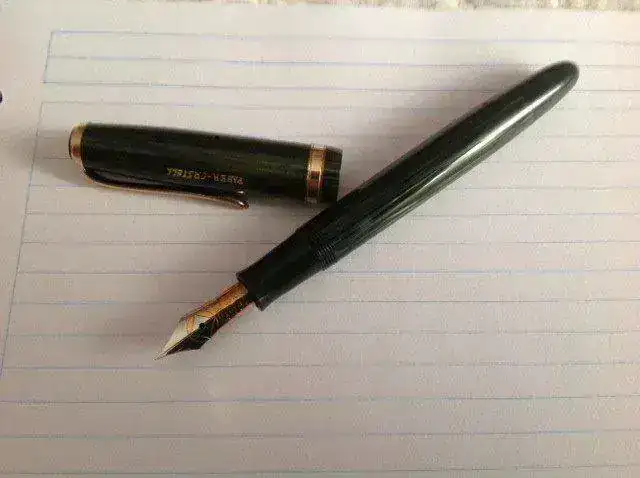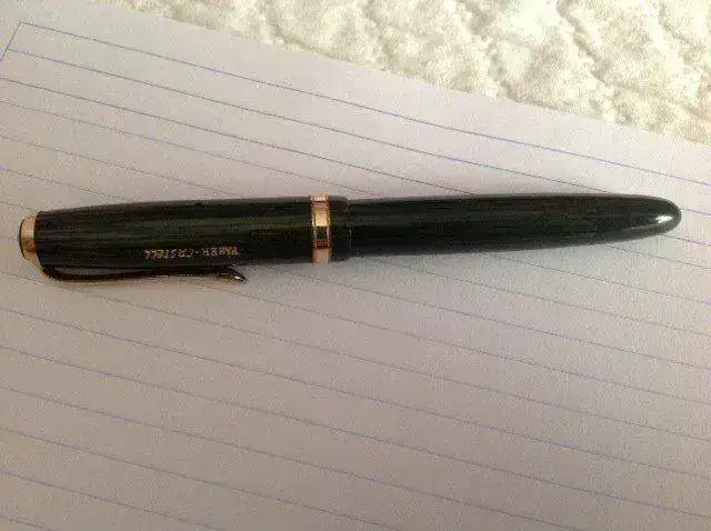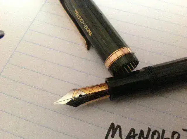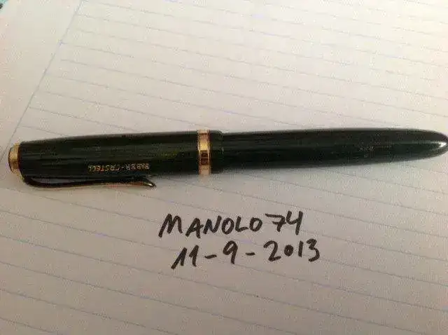 vendo esta estilográfica Osmia Faber Castell, modelo 884, con plumín F de oro, bicolor y de muy buen tamaño, y cuerpo y capuchón en celuloide verde estriado, con una acusada transparencia. Este es uno de los modelos de mayor porte de la marca alemana Osmia, de tamaño ligeramente mayor a una Pelikan 400. El estado de conservación es impresionante dada la edad de la pieza (creo que es de los años 50), parece recién salida de la fabrica. Escribe un F con muy buen flujo, no flexible. No se ve en las fotos pero el capuchón lleva el logotipo de Osmia en la parte superior, como corresponde.