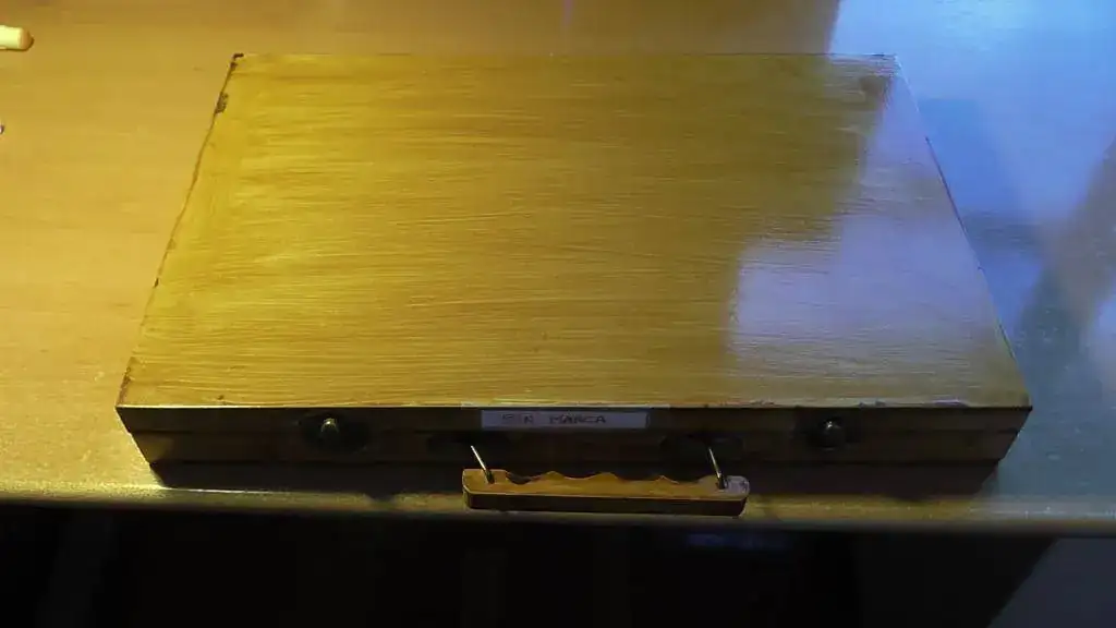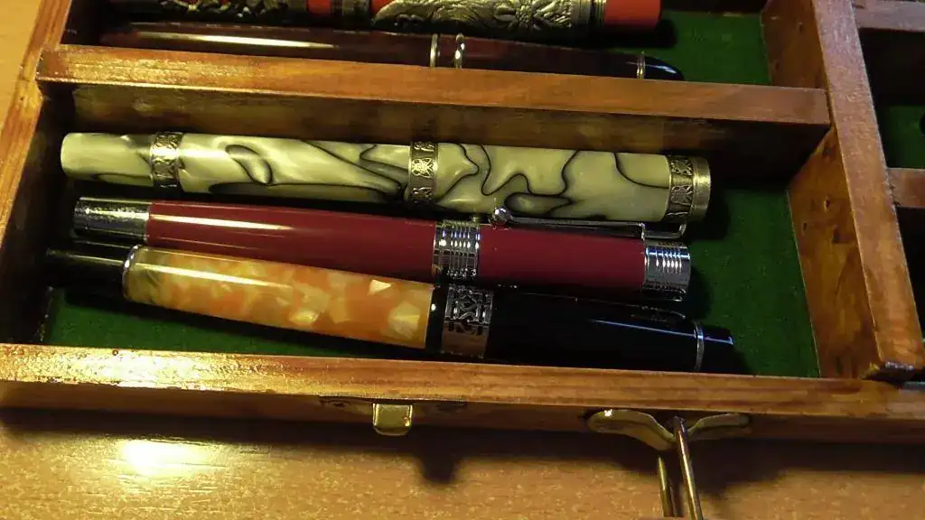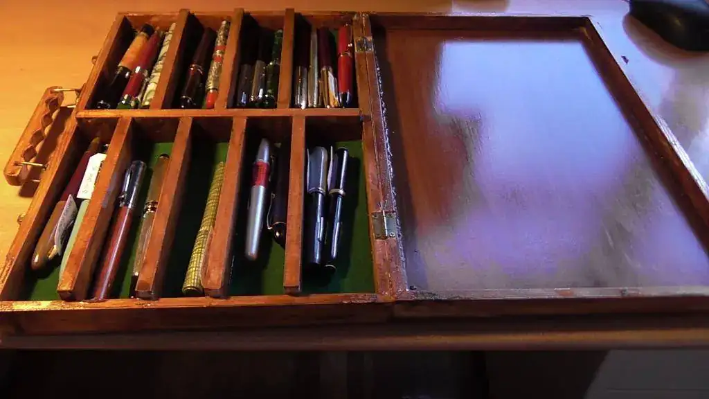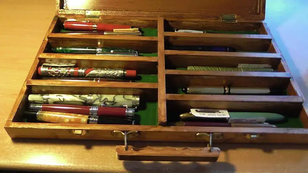 La caja, le pude unos listones de madera claveteados y encolados entre si, en los huecos puse fieltro autoadherente, para que las plumas no se golpeen entre si, y este fue el resultado, de una caja de acuerelas que había acabado en la basura (también sirve para este fin una caja de puros de madera vacía, las regalan en los estancos, si se conoce un poco al estanquero/a).