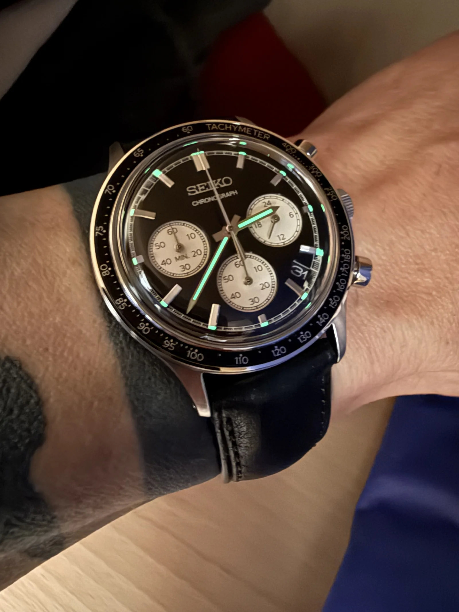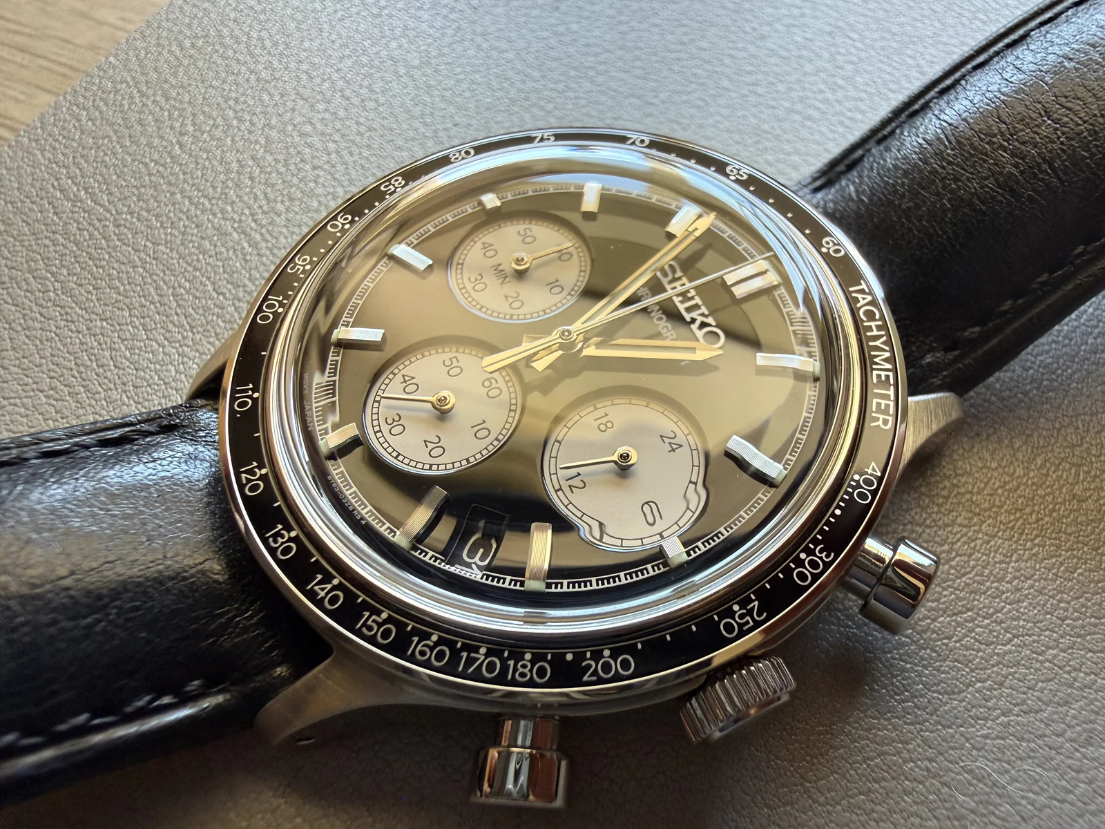 La esfera presenta los índices en relieve al igual que el logo de Seiko con una tipografía bastante escueta y sencilla, lo cual se agradece sin tanta literatura, las subesferas del crono se encuentras en un segundo plano favoreciendo ese juego de profundidades. Decir que en esta referencia, color negro la esfera es lisa y brillante pero en la versión verde y azul es granulada. Si tuviera que ponerle un pero es la fecha cortando las divisiones de los segundo, pero está muy bien integrada al tener el fondo negro del mismo color que la esfera.