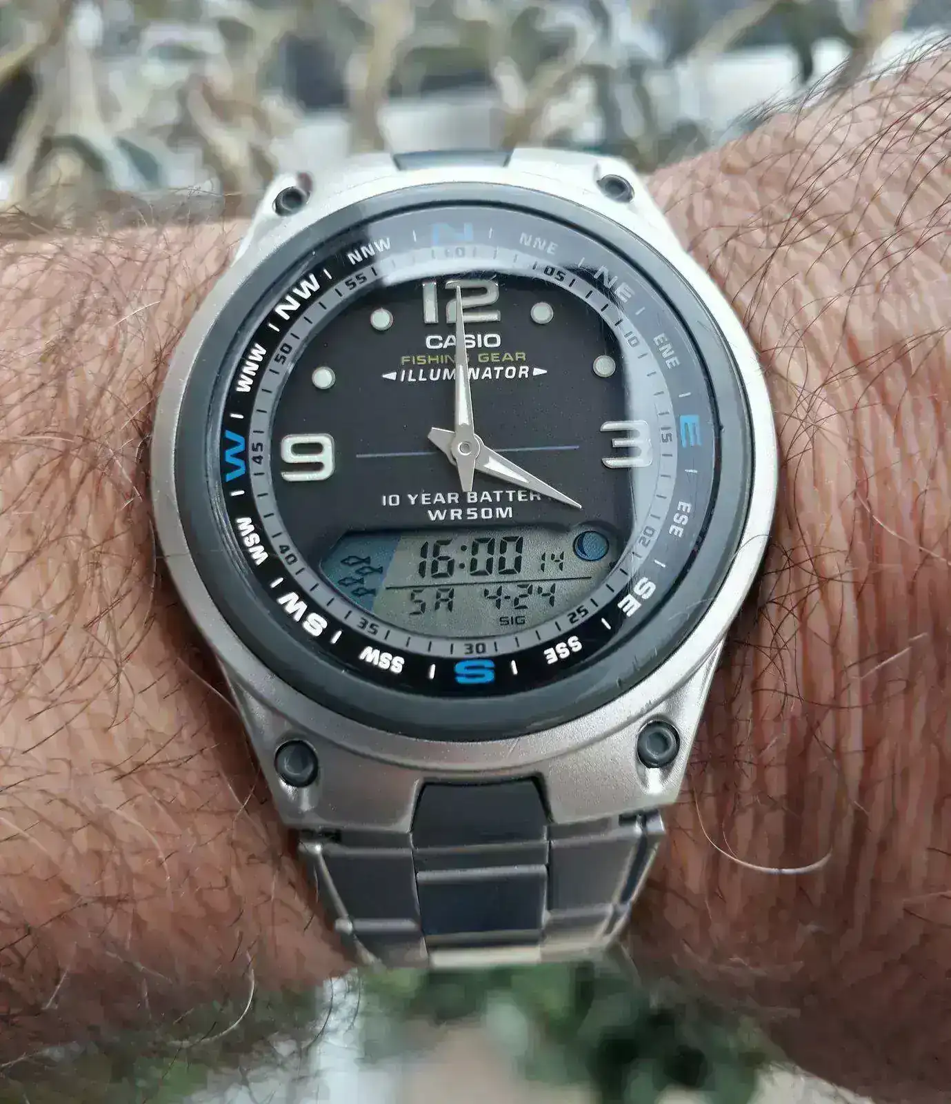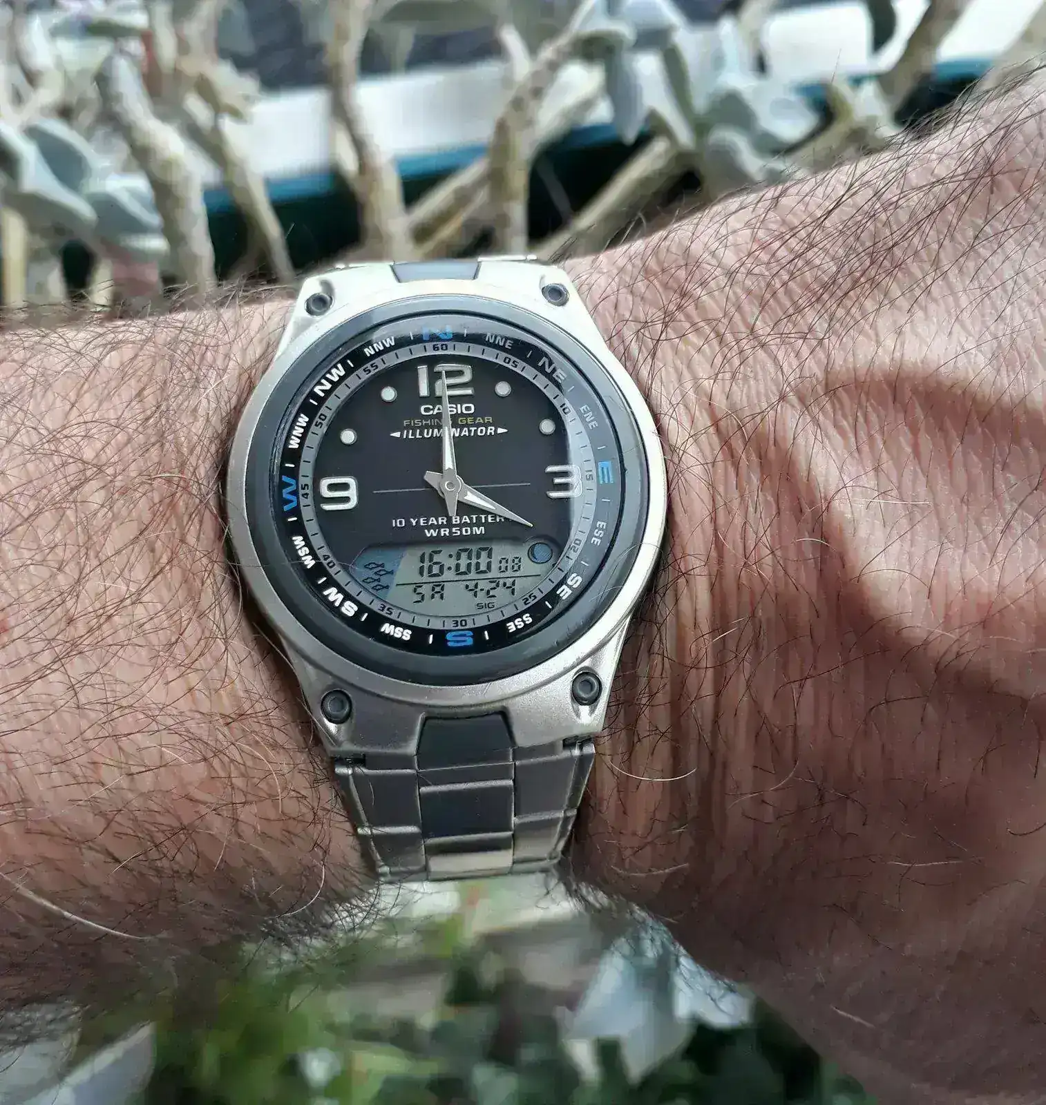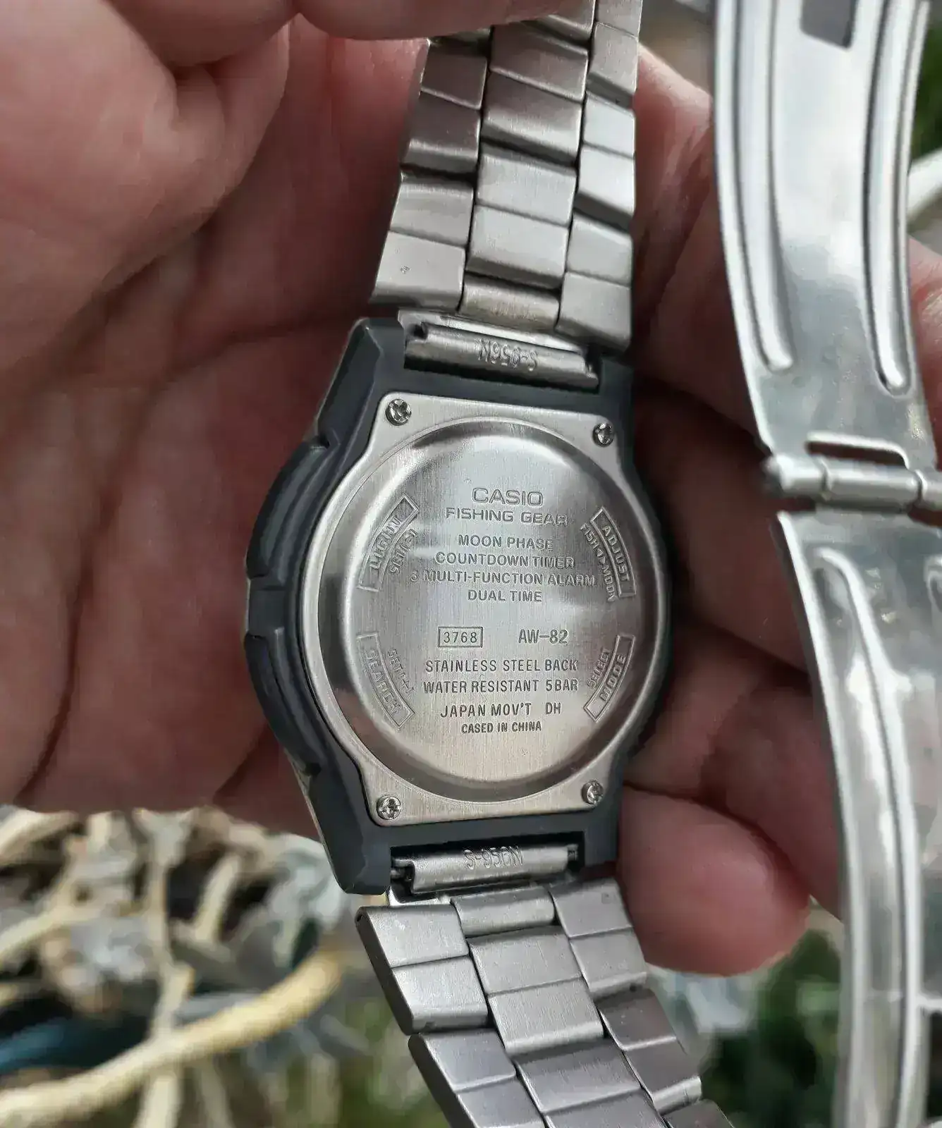 Buen sábado para todos hoy les comparto una nueva compra y restauración propia esta vez le toco a un Casio AW82 fishing gear - mon phase modulo 3768. El cual me llego sin funcionar, vidrio /plexi rayado al igual que el brazalete,que lo trae en el centro con pulido brillante y en los laterales solo mate. Se le coloco pila nueva SR2025,limpieza y pulido completo esta pieza la compre a buen precio $1.600 nuevo esta en unos $