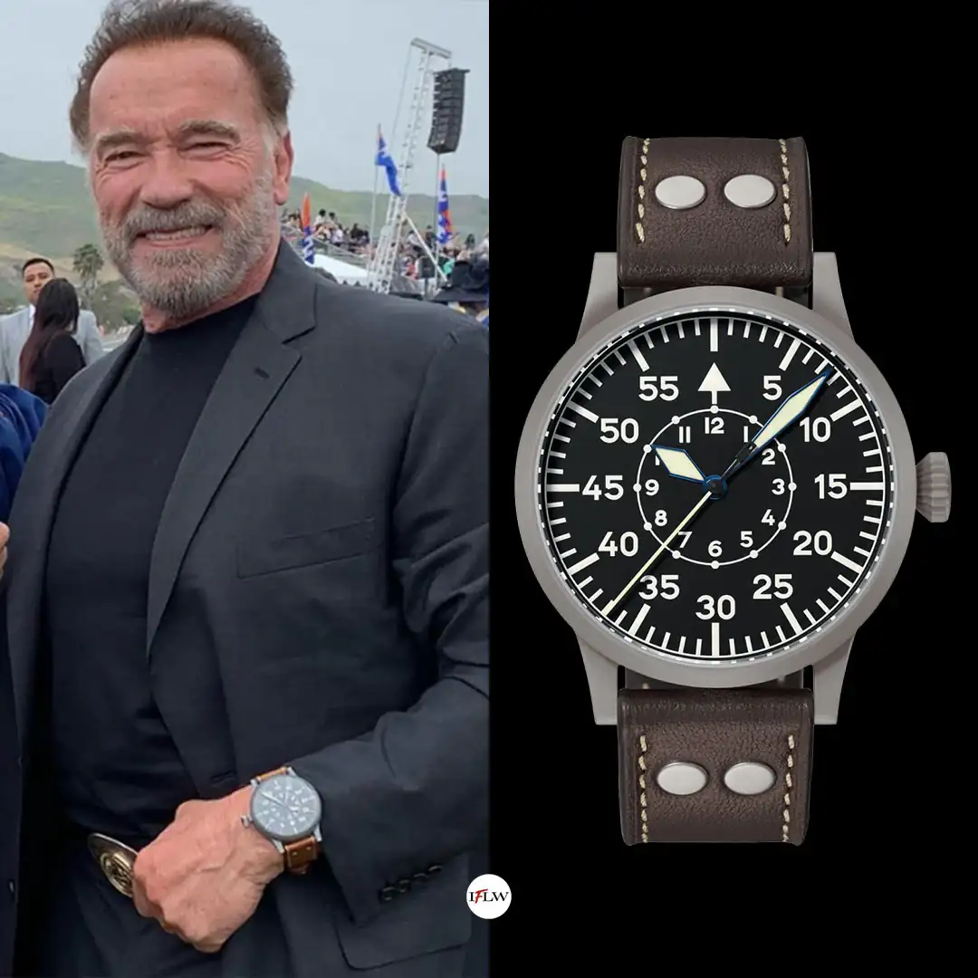 Aquí Arnold cuando estaba grande de verdad con un Tissot de 36, le queda bien. En la segunda foto con un Laco; le pega porque es Arnold y es un flieger pero joé, se ve enorme.