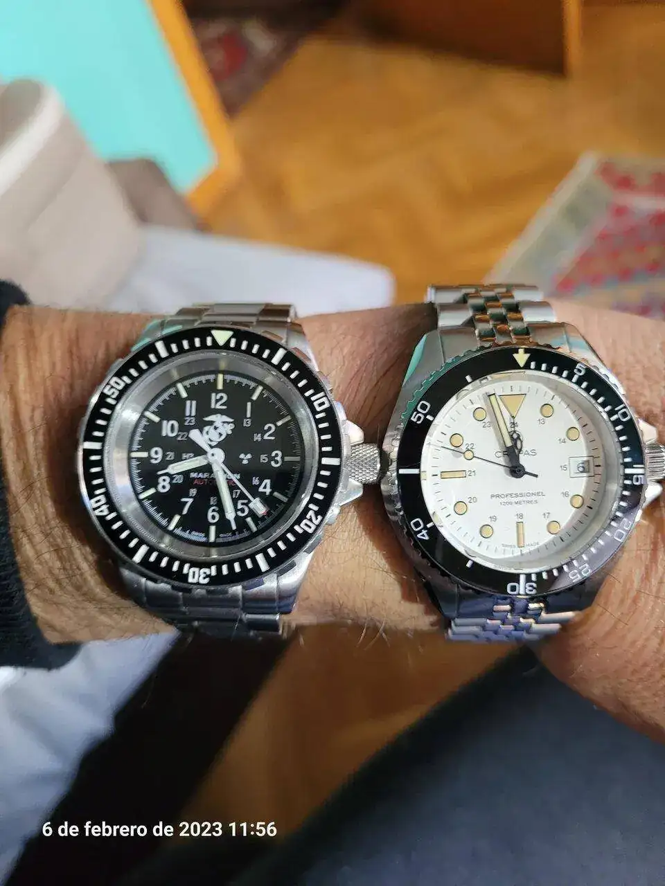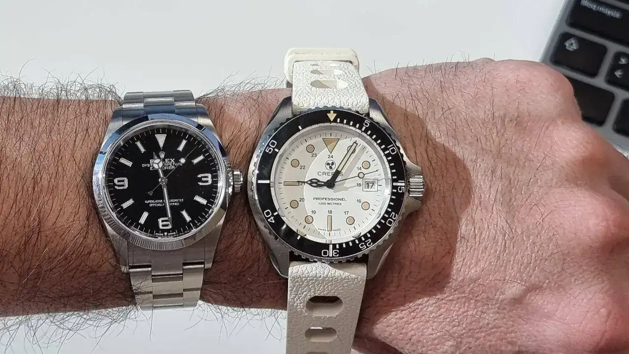 Hoy llevo el Explorer de 36mm, que es un reloj bien pequeño. Pues fijaos en la foto junto al Crepas. Y eso que el dial del Crepas es blanco, que normalmente aparenta ser más grande: