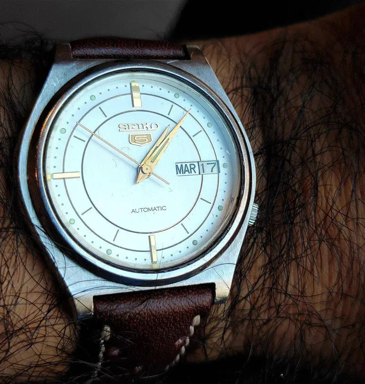 Hace un tiempo me empezaron a llamar la atención los vintage, dentro de lo más asequible y totalmente aptos para el uso diario, analice una enorme variedad de Seikos entre las décadas de 60 y 80. Cada tanto, uno se viene para casa. Antes fue un 7009 en condicion de NOS, que me sorprendió su precision luego de 40 años sin uso y nunca haberse revisado. Ahora encontré este Seiko 5, fabricado en el año 1980, que me gustó por la esfera y los toques dorados. El estado estético es muy bueno, no presentaba ningún problema grave de funcionamiento pero evidentemente comprobe que estaba fuera de escape. Nada que una simple revisión en la relojería lo solucionara y quedará listo para su uso. Nuevamente me traje un 7009, por lo que he visto, uno de los calibres más confiables y que más tiempo mantuvo Seiko en producción. Aclaracion aparte, el brazalete que traía creo que no era del modelo, muy incómodo además, fue cambiado por una correa de piel.