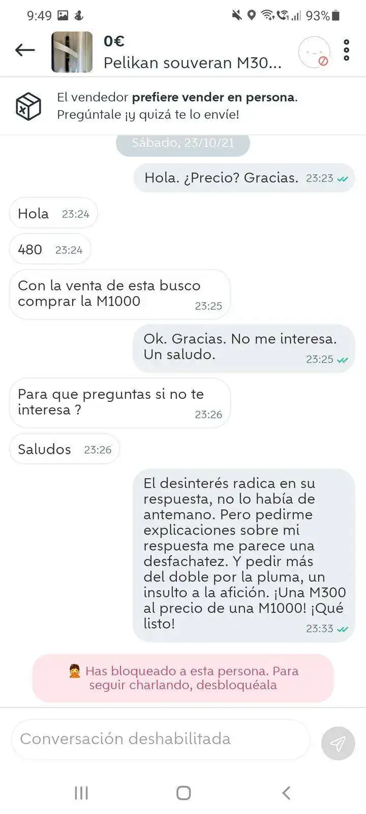 El individuo, de Reus (Tarragona), me responde que la vende para comprarse una Pelikan M1000 y me pide, esto les va a encantar, 480 pavos. 480 pavos por el modelo estándar. Si. La de rayas verdes y negras como cualquiera de las tres que tengo. Le doy las gracias por atenderme, le digo que no me interesa y me despido. Doy por la curiosidad satisfecha y el tema cerrado.