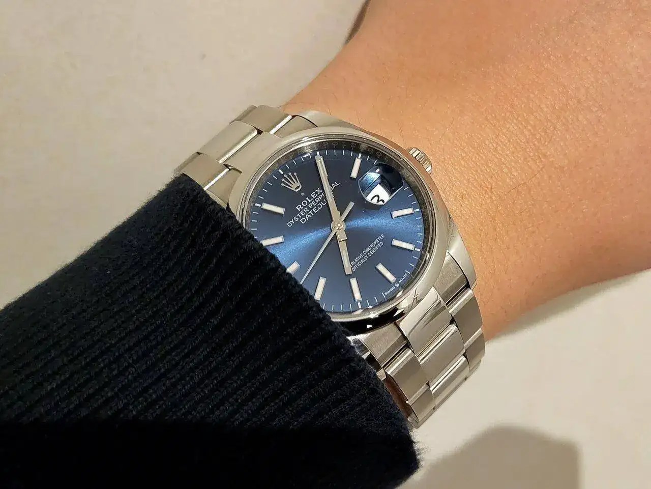 Si que en conjunto se ve muy bien, pero si me gustaría tener los dos brazaletes por cambiar.No creo que haya una respuesta correcta. Cualquiera de las opciones son válidas. A mí gusta más el DJ con bisel liso, y respecto al brazalete, en el caso de tu reloj creo que le sienta mejor el oyster. Por ahí con otro color de esfera, un plateado por ejemplo, iría mejor el jubilee. El azul con el oyster se ve muy deportivo y contemporáneo sin perder el toque clásico. Saludos.