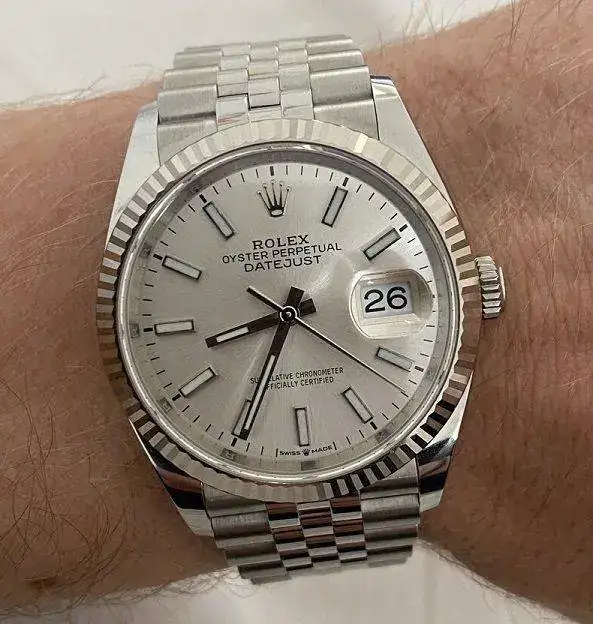 Pues a mí me parece que un Datejust como el que presentas, pero con la esfera azul como el de @rogeroyster , sería un candidato muy serio y muy bueno a tu colección.Aquí uno con muñeca de 17cm en verano, 16.5 en invierno y un OP36mm que me queda como un guante, pero si ni el dinero ni la disponibilidad fuesen problema tendría dos 36mm.