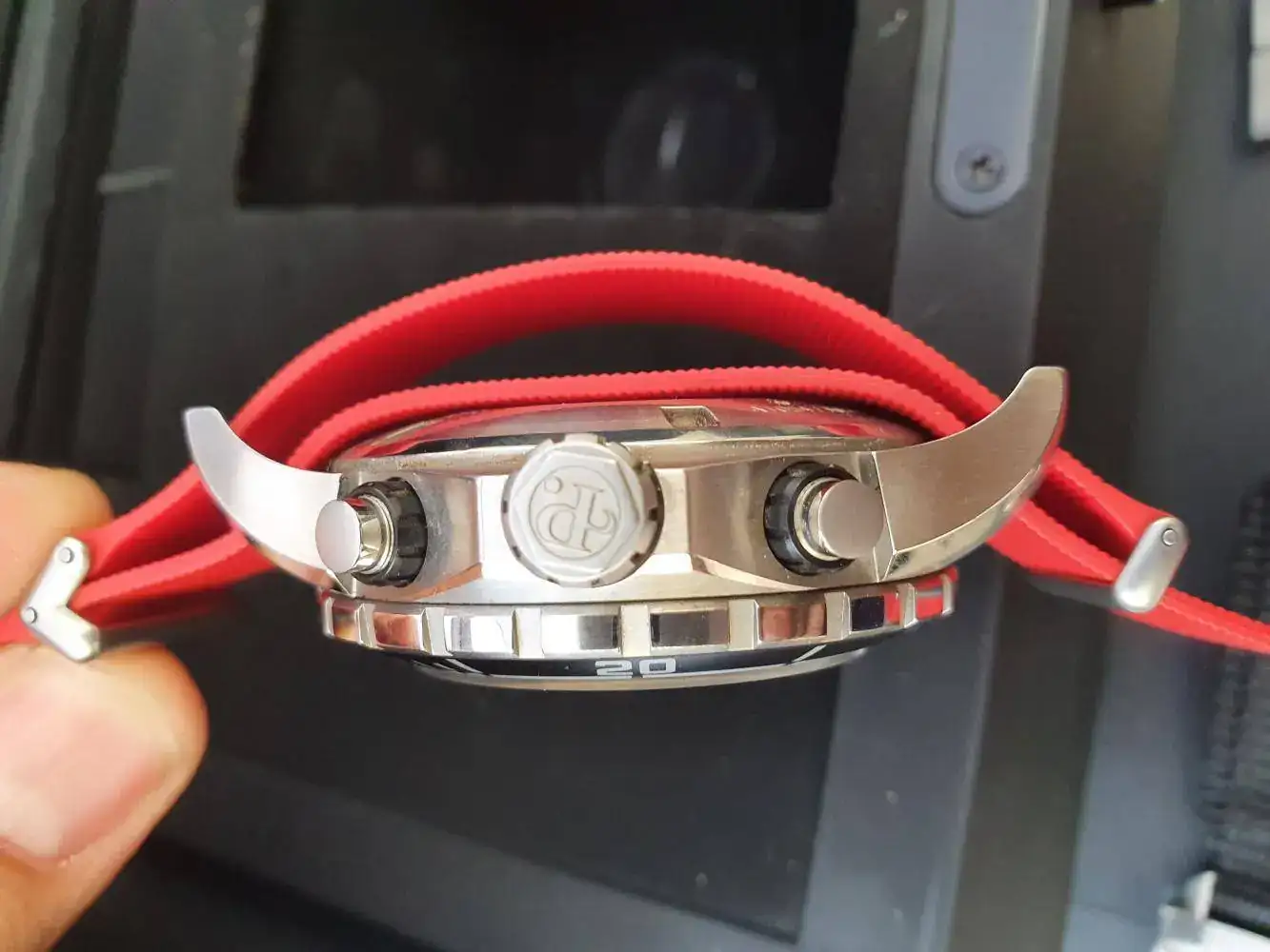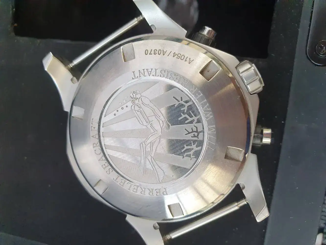 Caja: Acero, 45mm, corona y pulsadores roscados. Estanqueidad de 777m.