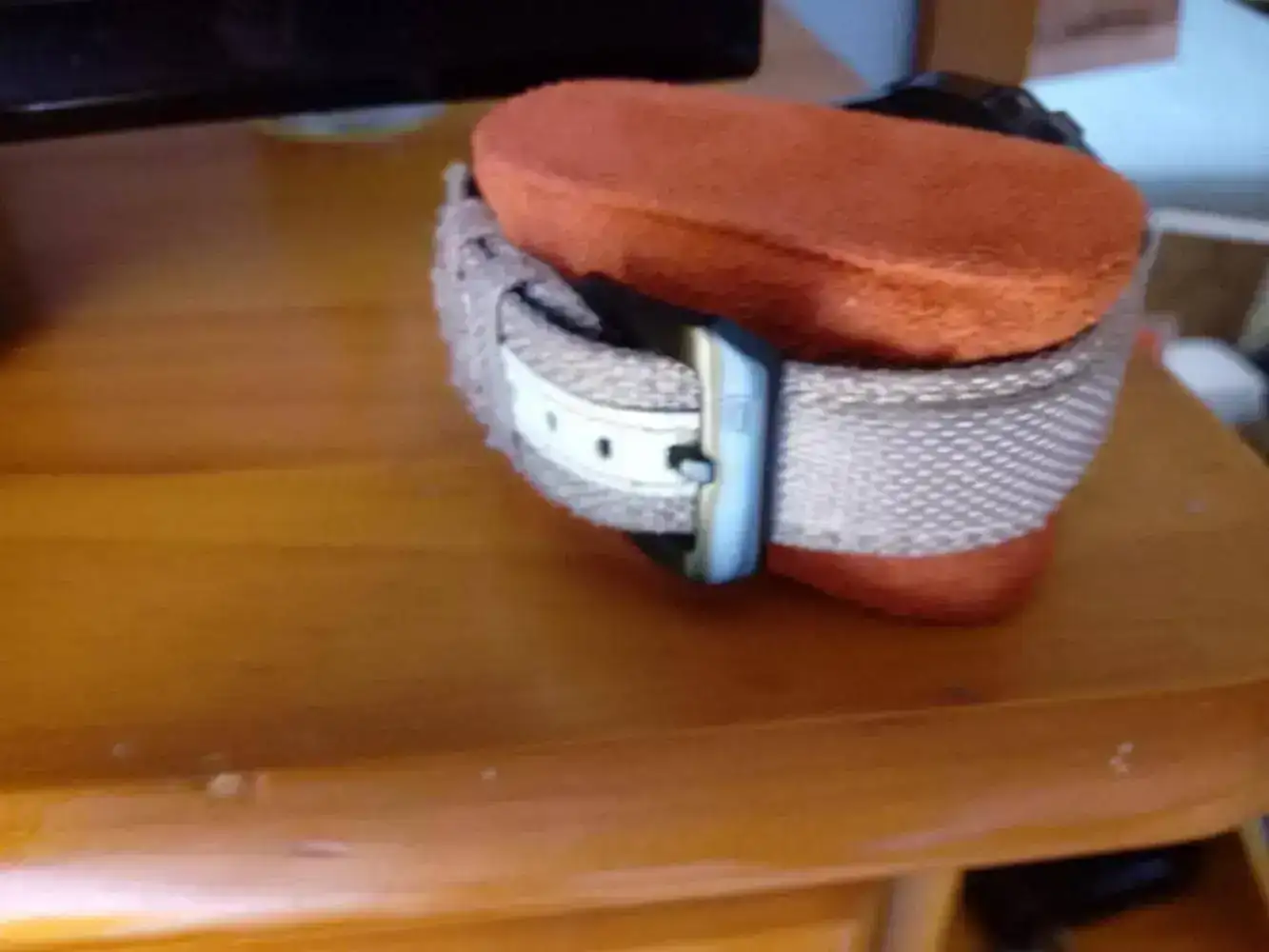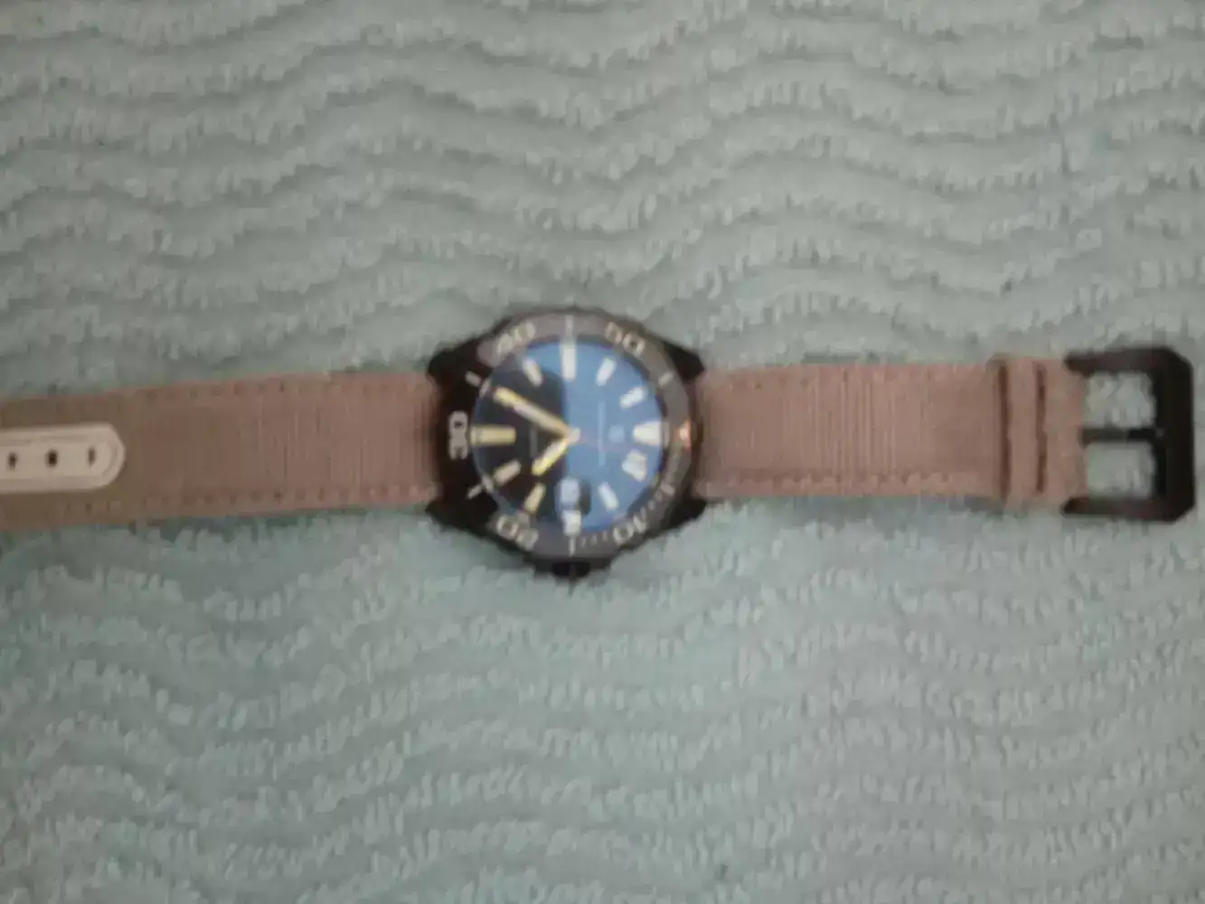 Y tiene puesta su correa canvas,color arena,en piel y textil original.El ardillon esta personalizado con el logo de la marca.