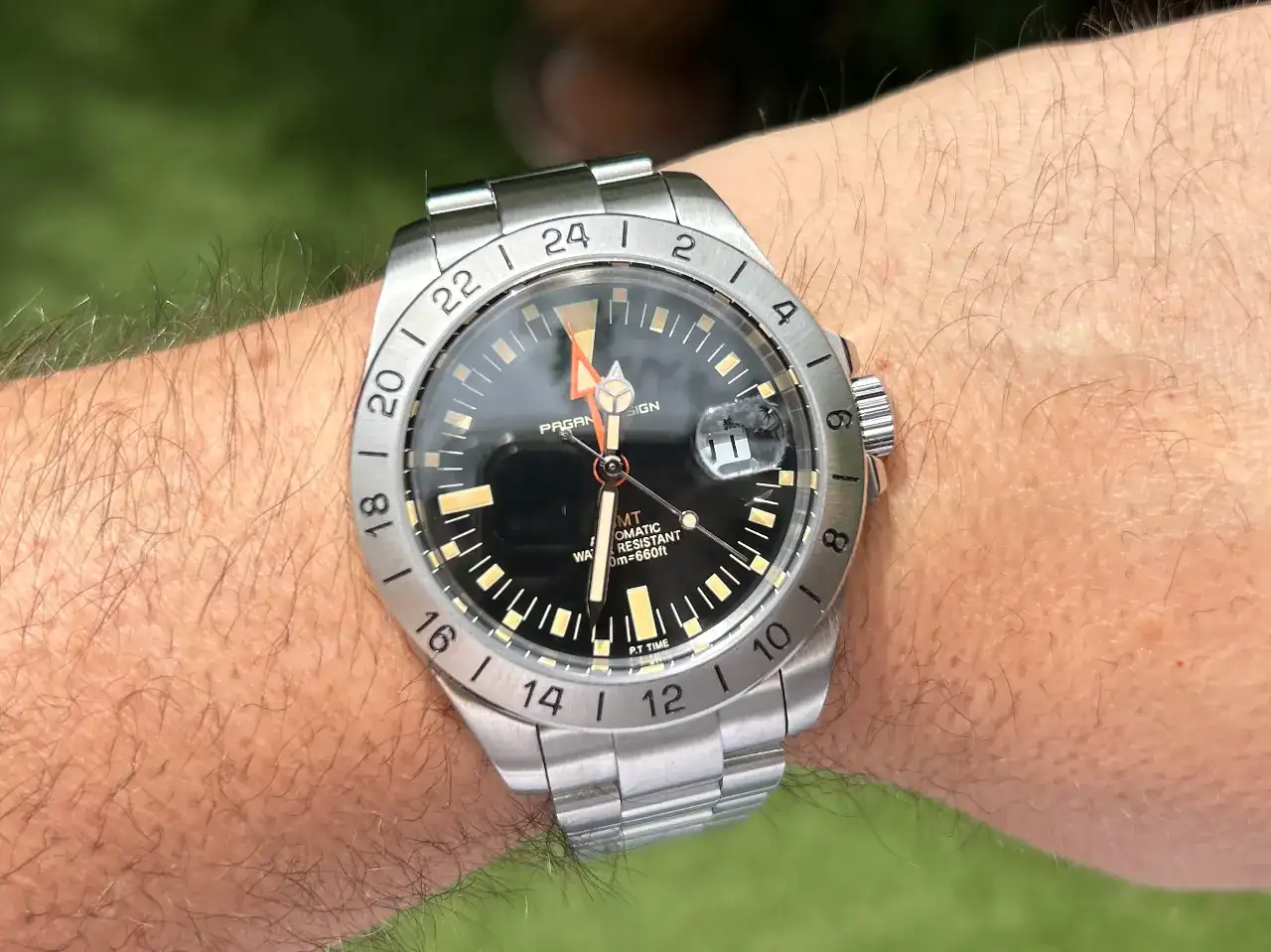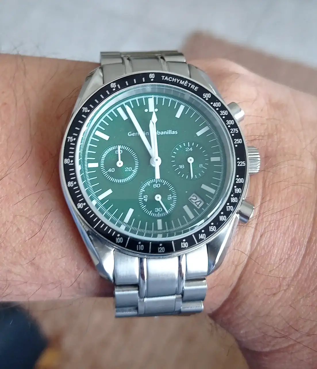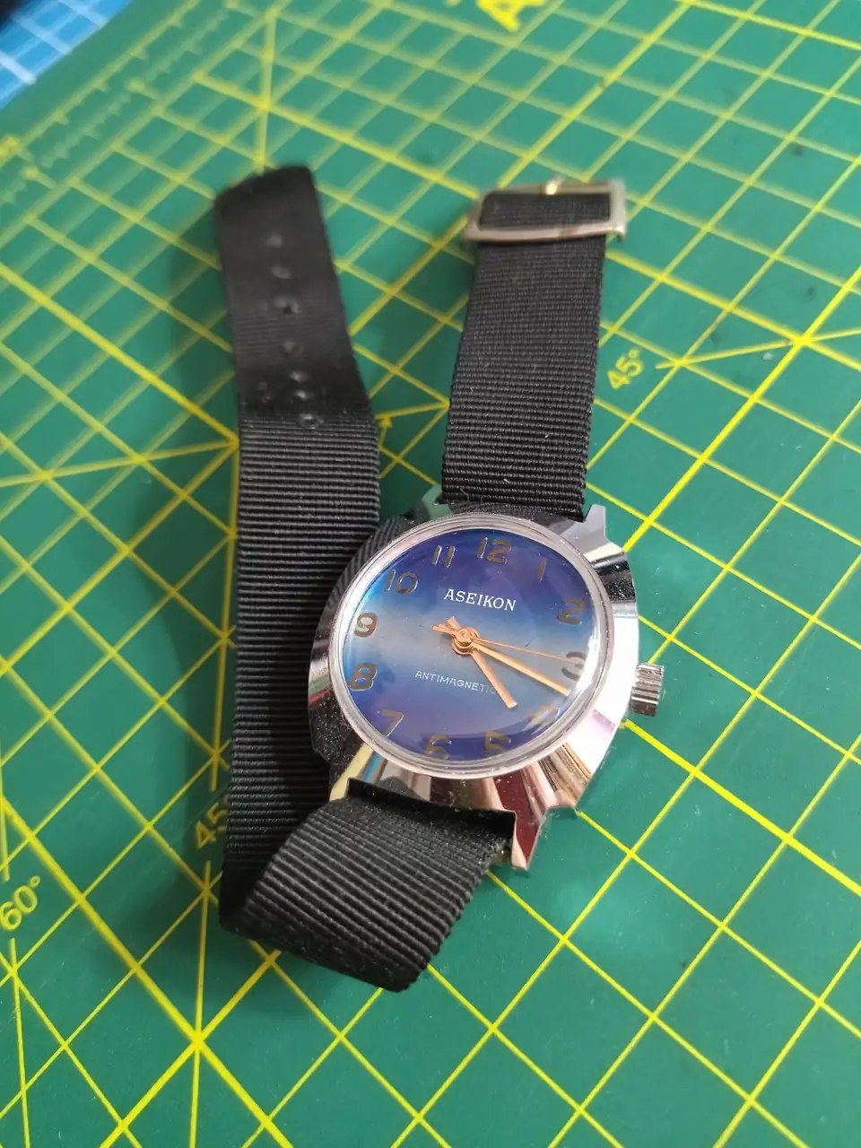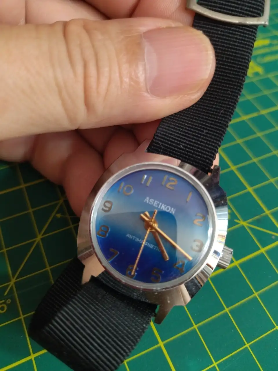 Fue obsequio de un viejo relojero, despues de comprarle algunos brazaletes de epoca que tenia sin vender en su relojeria, estuvimos platicando un rato y me mostro este, tenia una caja llena, mecanismo de cuerda de una sola joya, ruidoso, pero muy bien afinado.