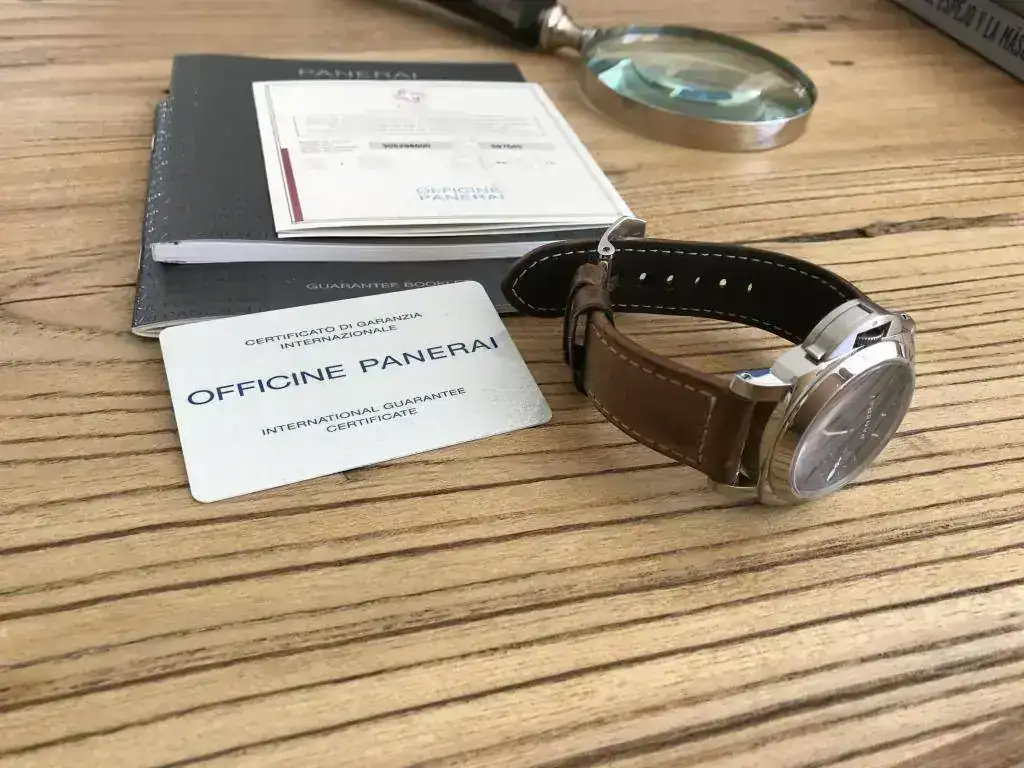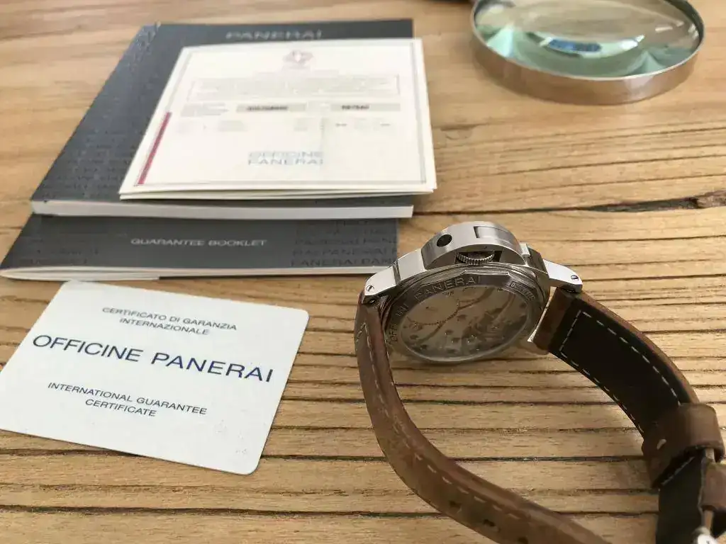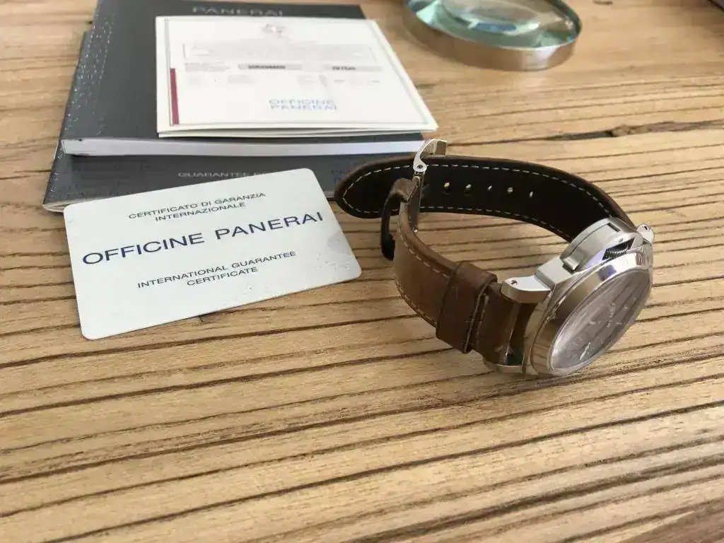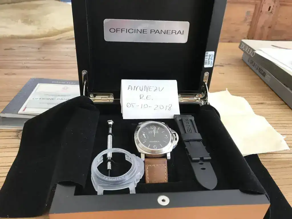Dotación completa:caja de cartón exterior,protectores,caja de madera,stickers,paño,destornillador,libritos,certificado COSC,protector de plástico ,tarjeta de garantía y correa de caucho negro Panerai nueva.
