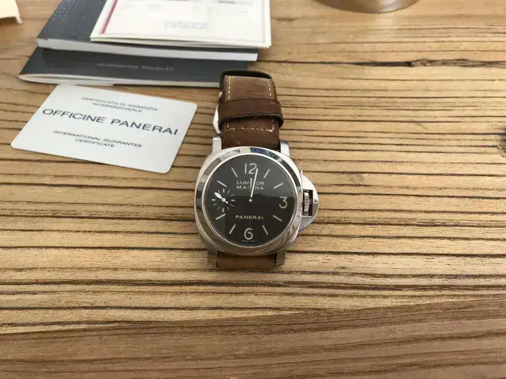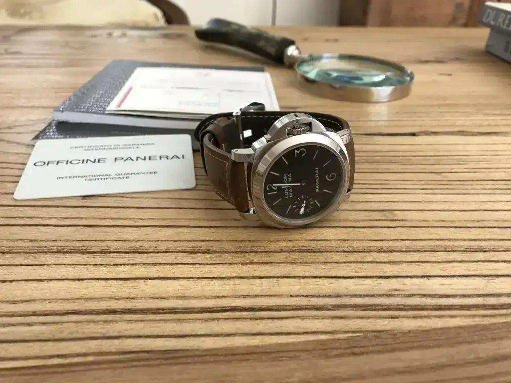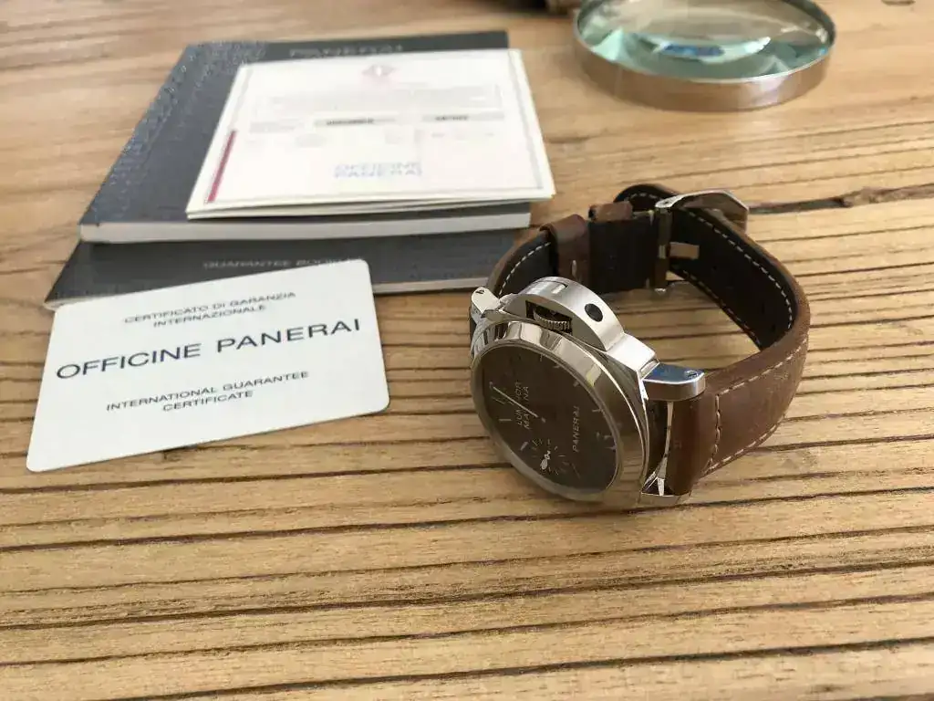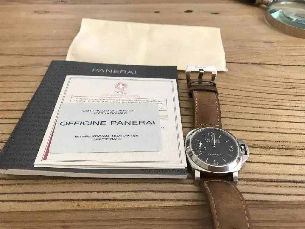 Dotación completa:caja de cartón exterior,protectores,caja de madera,stickers,paño,destornillador,libritos,certificado COSC,protector de plástico ,tarjeta de garantía y correa de caucho negro Panerai nueva.