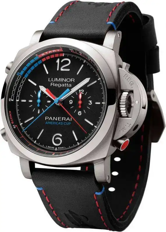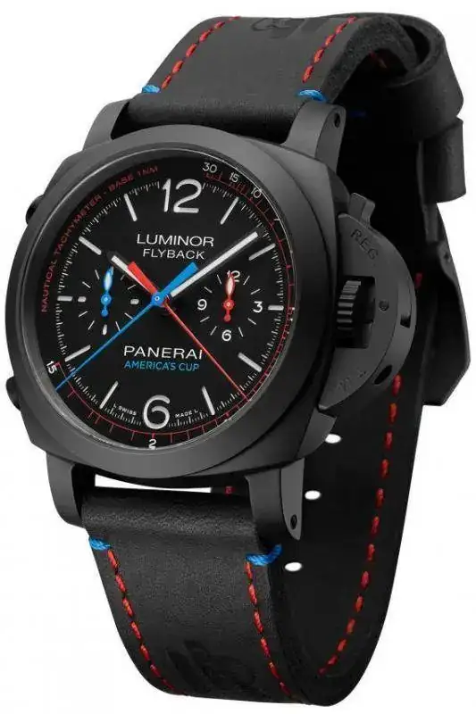 Oracle Team USA está representado por tres relojes nuevos. El Panerai Luminor 1950 Equipo de Oracle USA 3 Días Chrono Flyback Automático Ceramica - 44mm es una de las dos piezas equipadas con una función de cronógrafo flyback. Tiene una caja de 44 mm de cerámica negra mate y resistente al agua a 100 metros. El respaldo, que está hecho de titanio, está grabado en relieve con el logo de Oracle Team USA y la inscripción "35th America's Cup". El movimiento, la fabricación de Calibre P.9100, equipa el reloj con un cronógrafo de rueda de columna que se detiene y se inicia Por el empujador a las 10 horas, mientras que la función de retroceso puede ser acoplada por el empujador a las 8 en punto. Los colores de la America's Cup son evidentes en las manos de los cronógrafos de color rojo y azul, la manecilla de las horas del cronógrafo rojo y la pequeña mano azul de los segundos. Una escala de taquímetro, que puede usarse para medir la velocidad de un buque en nudos, también es roja. En la correa de cuero negro, junto con el logo de la Copa con estampado en caliente, aparecen costura roja (con un toque de azul). Limitado a 200 piezas, el reloj tiene un precio de $ 15.300.