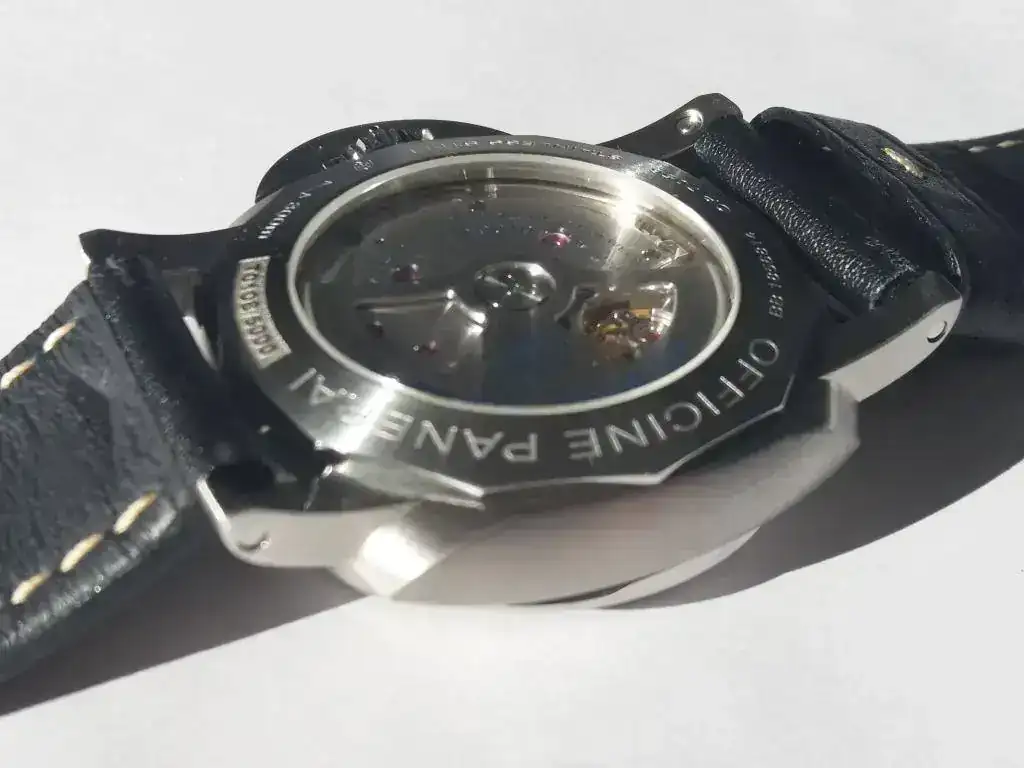 Movimiento automatico manufactura, integramente realizado por Panerai, tiene 13 lineas y ¾, lleva volante Glucydurâ, dos barriletes y dispone de un dispositivo antichoc IncablocÒ. Con 31 rubies se mueve a 28.800 alternancias por hora y tiene una reserva de marcha de 72 horas, es decir 3 dias. En su interior 200 componentes ponen en funcionamiento este movimiento.