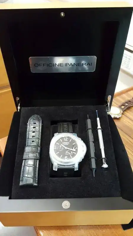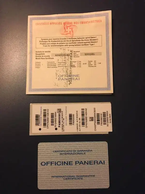 Tiene los papeles, caja, estuche, certificado COSC y la garantía sellada, aunque ya no vigente. Lo entrego con dos correas, la de caucho, algo usada pero en buen estado y con vida por delante, y la de cocodrilo negra, de reestreno. El 15 de junio de este año se le hizo una revisión general periódica, en el Servicio Técnico Oficial Panerai, por lo que funciona perfectamente y no necesitará que se le haga nada en bastante tiempo.