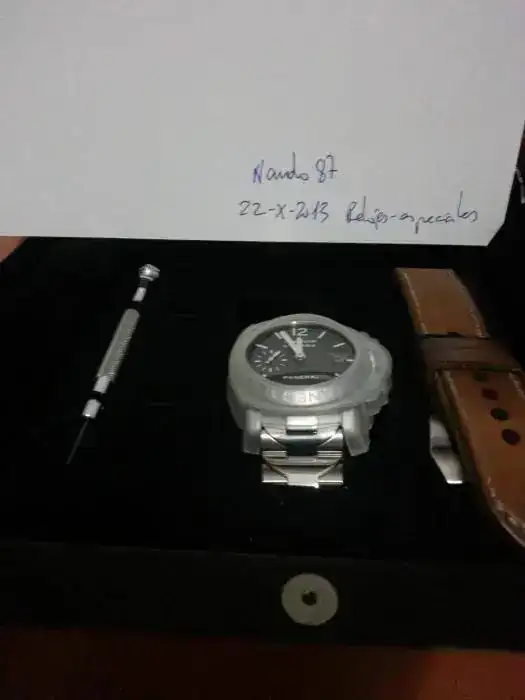 Hola. Vendo un Panerai 050 serie c recién llegado de una revisión, por lo cual su estado es excelente. Dispone de papeles de compra a mercante y de la reciente (llegado este mes) revisión en Panerai. En la revisión se ha incluido, además de los procedimientos habituales y a mi petición, la instalación del nuevo cierre doble para armís de la marca, mucho más sólido y contundente. Con caja y con una correa hecha por encargo de Peter Gunny.