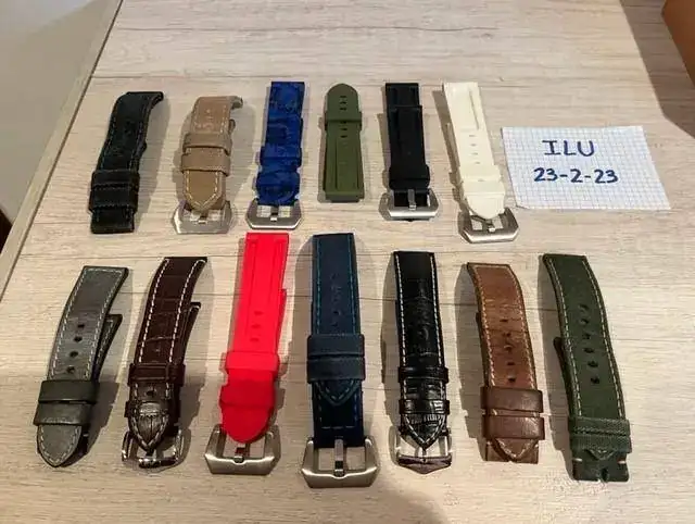 Brazalete: Incluye 14 correas (6 de caucho, negra original con poco uso, azul oscuro OEM, verde, rojo, blanca y azul camuflaje; 4 Canvas, verde, azul, negra y beige; 4 de cuero, cocodrilo original sin uso, negra, marrón oscuro y marrón de Jacob).
