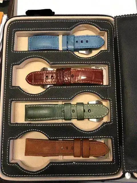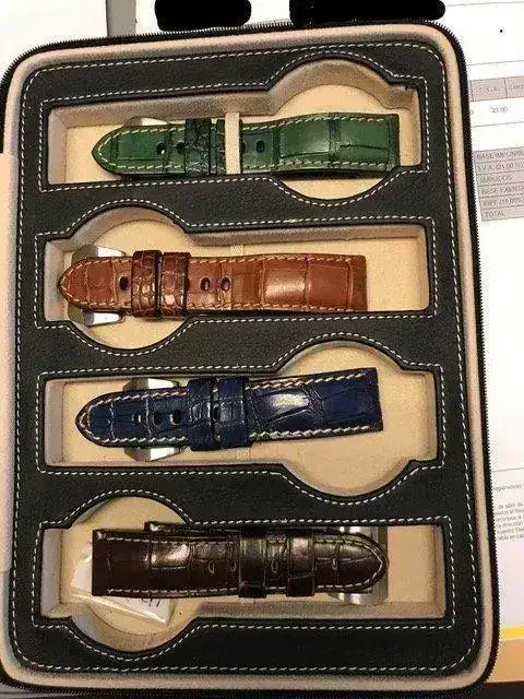 Son tres correas de vacuno mas cuatro de aligator del maestro Jacobo, más la marrón oscura de panerai. Las correas del maestro Jacobo están prácticamente nuevas, algunas solo han sido utilizadas una vez, para probarlas con el reloj, las correas costaron mas de 800.- €.