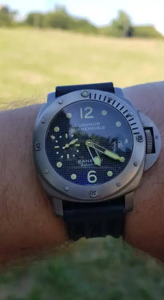 Al tener bisel se ve más pequeño en muñeca y el ser de titanio es un plus por ese color tan especial que tiene. Tiene índices salchicha y el movimiento es una valjoux 7750 modificada por panerai. La correa es artesana y desde que se la puse no quise cambiársela...