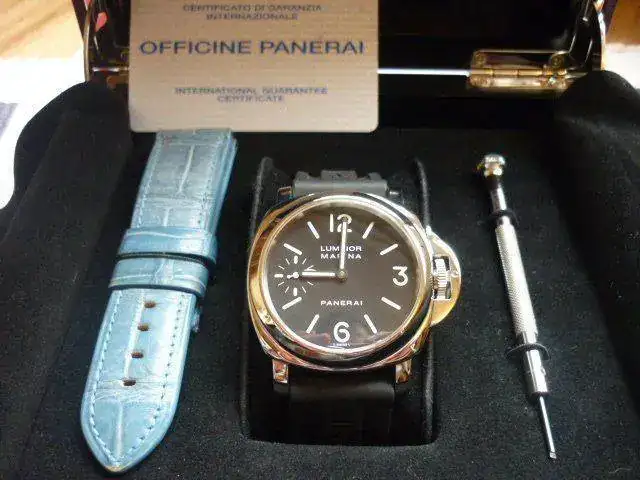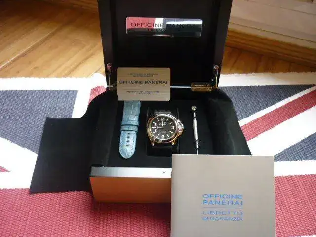 Después de pensarmelo mucho... saco a la venta mi Panerai 111, de la serie F, tiene el set completo, caja negra, de madera y toda su documentación, con la maquinaria decorada "Cotes Panerai", se encuentra en estado de reestreno, la caja y el cristal no tienen ni una sola marca ni micro raya, puedes verte en el como en un espejo, el caucho original nunca ha sido usado, la correa azul envejecida no es Panerai pero por la calidad de esta podria serlo, está practicamente nueva. No me interesan cambios, ya que he adquirido otra pieza.