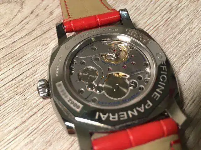 - Integramente realizado por Panerai, 12 líneas, 3 mm de espesor, 19 rubíes, volante Glucydur®, 21.600 alternancias/hora