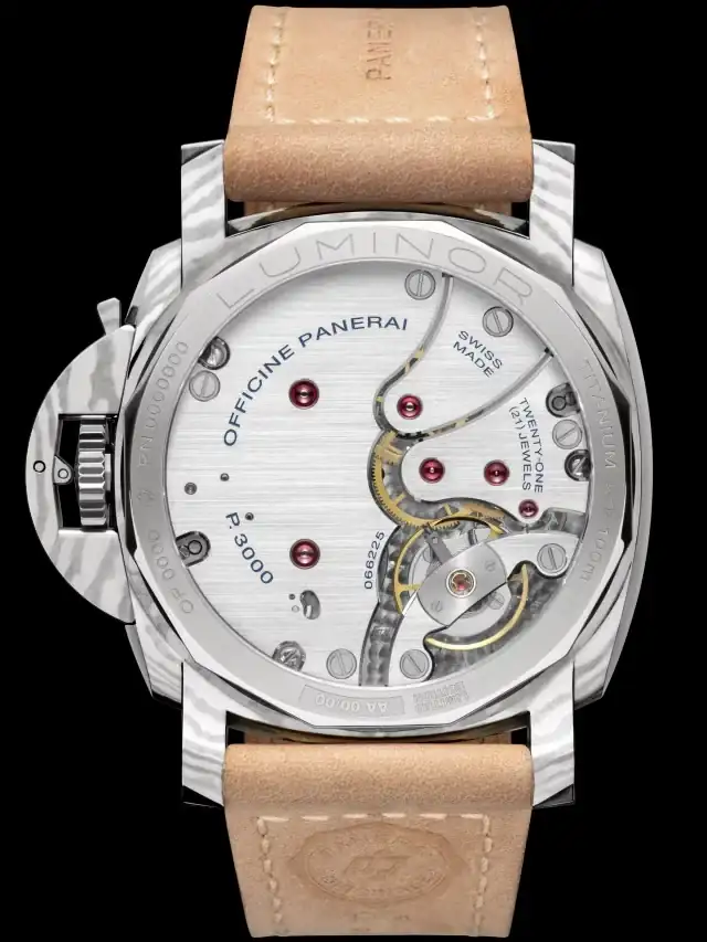 El calibre de este modelo es mecánico de cuerda manual, calibre Panerai P.3000, 16½ líneas, 5,3 mm de espesor, 21 rubíes, volante Glucydur®, 21 600 alternancias/hora. Dispositivo antichoque Incabloc®. Reserva de marcha de 3 días, dos barriletes. 161 componentes.