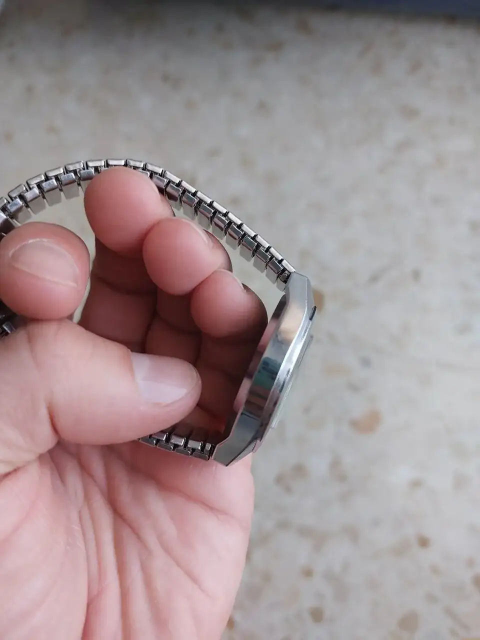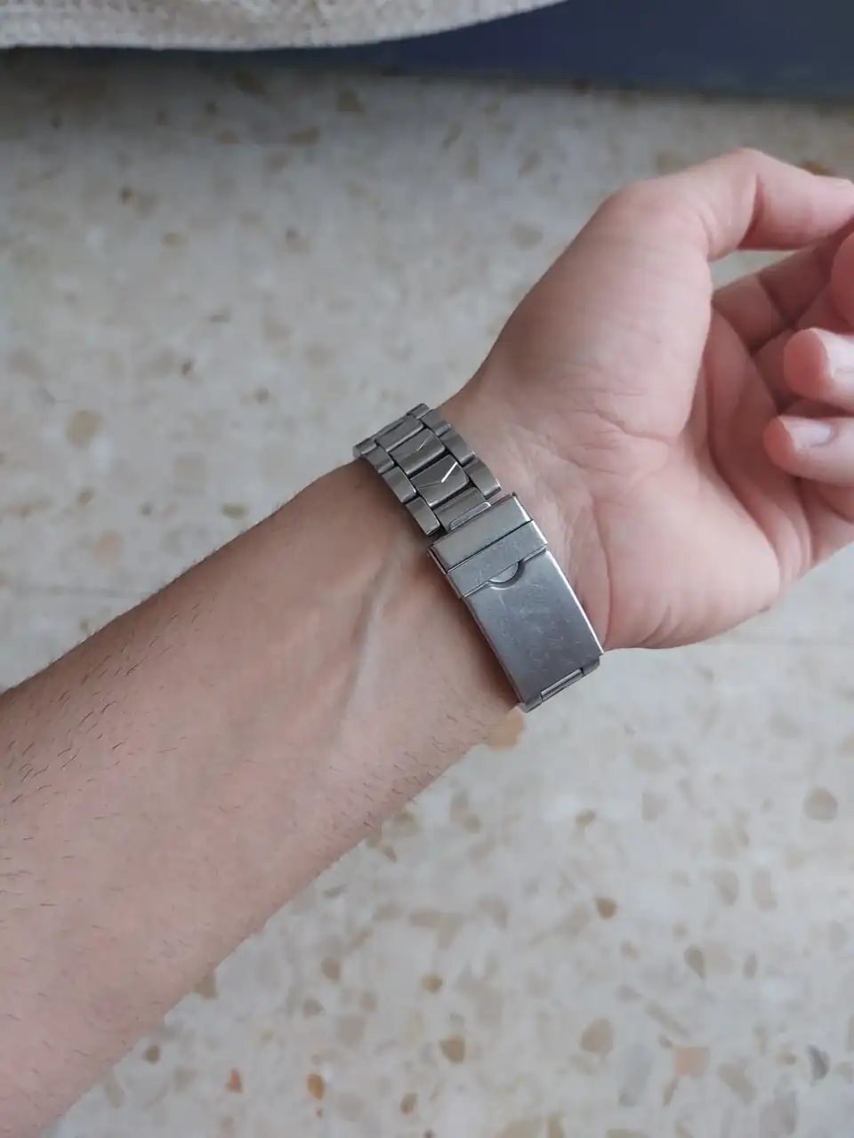 Venía con esa correa metálica extensible, pero le he puesto esta que tenía por casa: