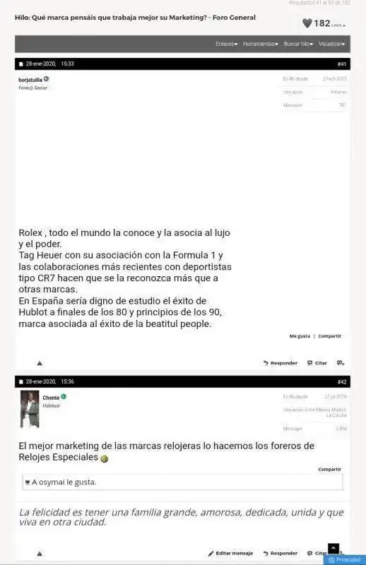 • El foro de relojes de habla hispana con más tráfico de la Red, donde un reloj es algo más que un objeto que da la hora. Relojes Especiales es el punto de referencia para hablar de relojes de todas las marcas, desde Rolex hasta Seiko, alta relojería, relojes de pulsera y de bolsillo, relojería gruesa y vintages, pero también de estilográficas. Además, disponemos de un foro de compraventa donde podrás encontrar el reloj que buscas al mejor precio. Para poder participar tendrás que registrarte.