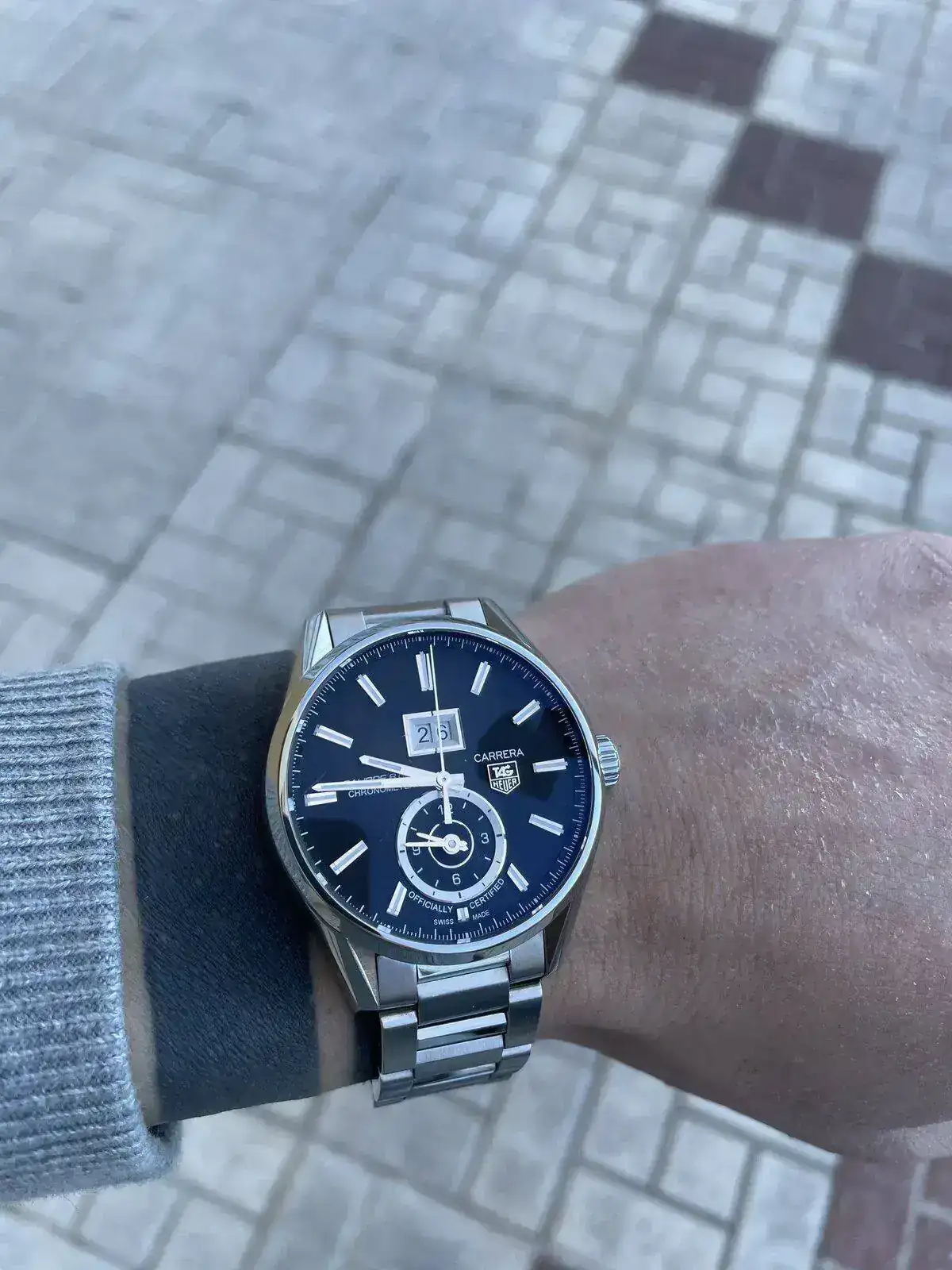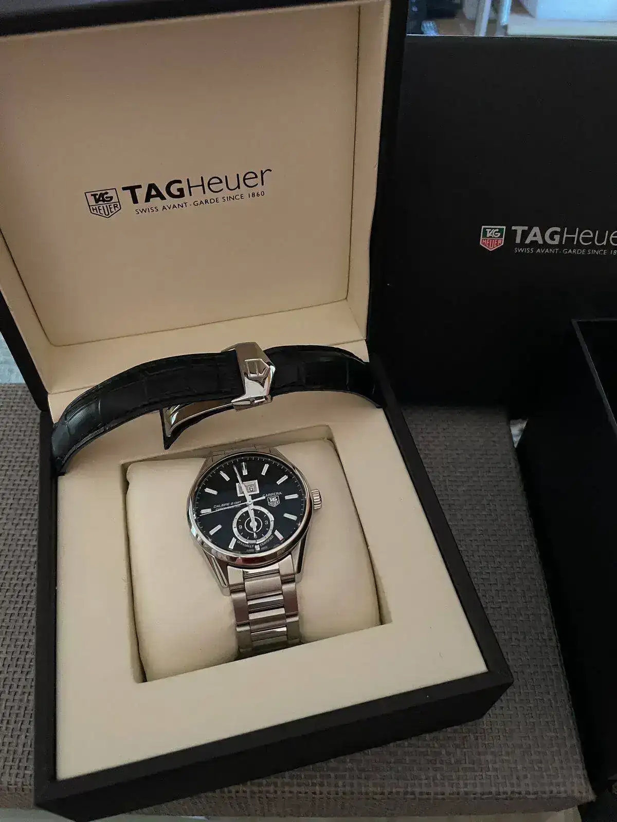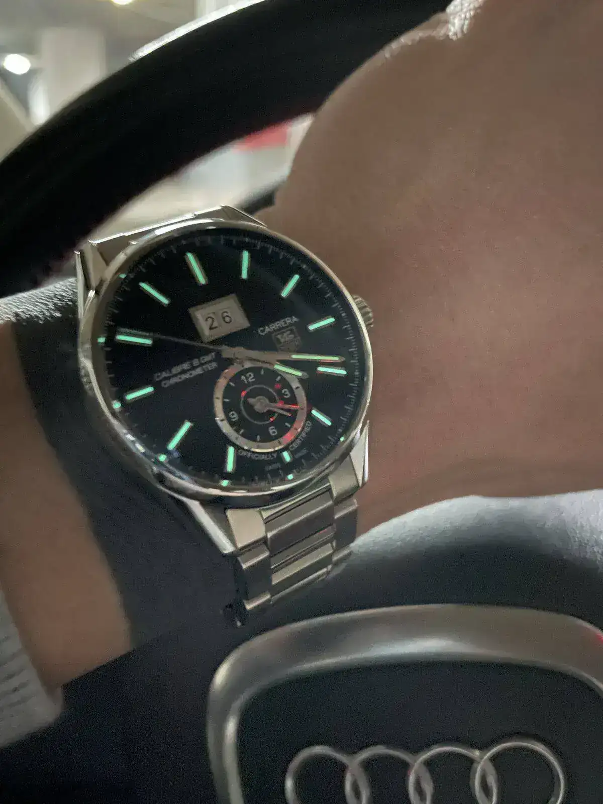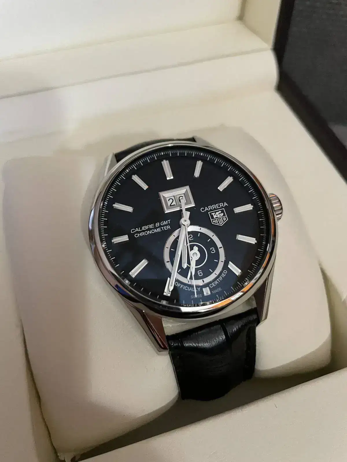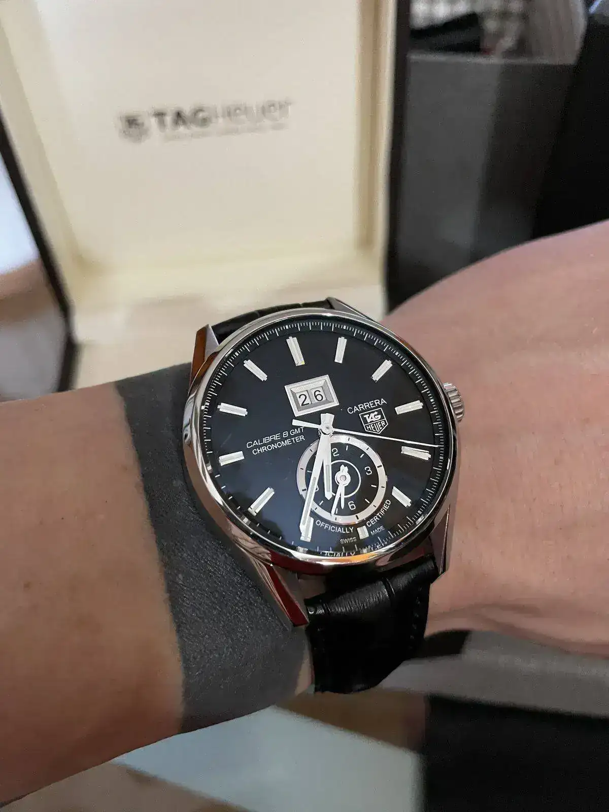 El reloj del que estoy hablando es el Tag Heuer Carrera Calibre 8 GMT, 41mm de caja, 49mm de asa a asa, 13mm de alto, un reloj que para mi gusto con su diseño se ajusta muy bien a la muñeca tanto con armis como con cuero.Y con Certificado parámetros COSC. Muy buen lumen como podéis comprobar en las fotos, todos los Tag heuer que he tenido en mis manos han ido bastante sobrados en ese aspecto.