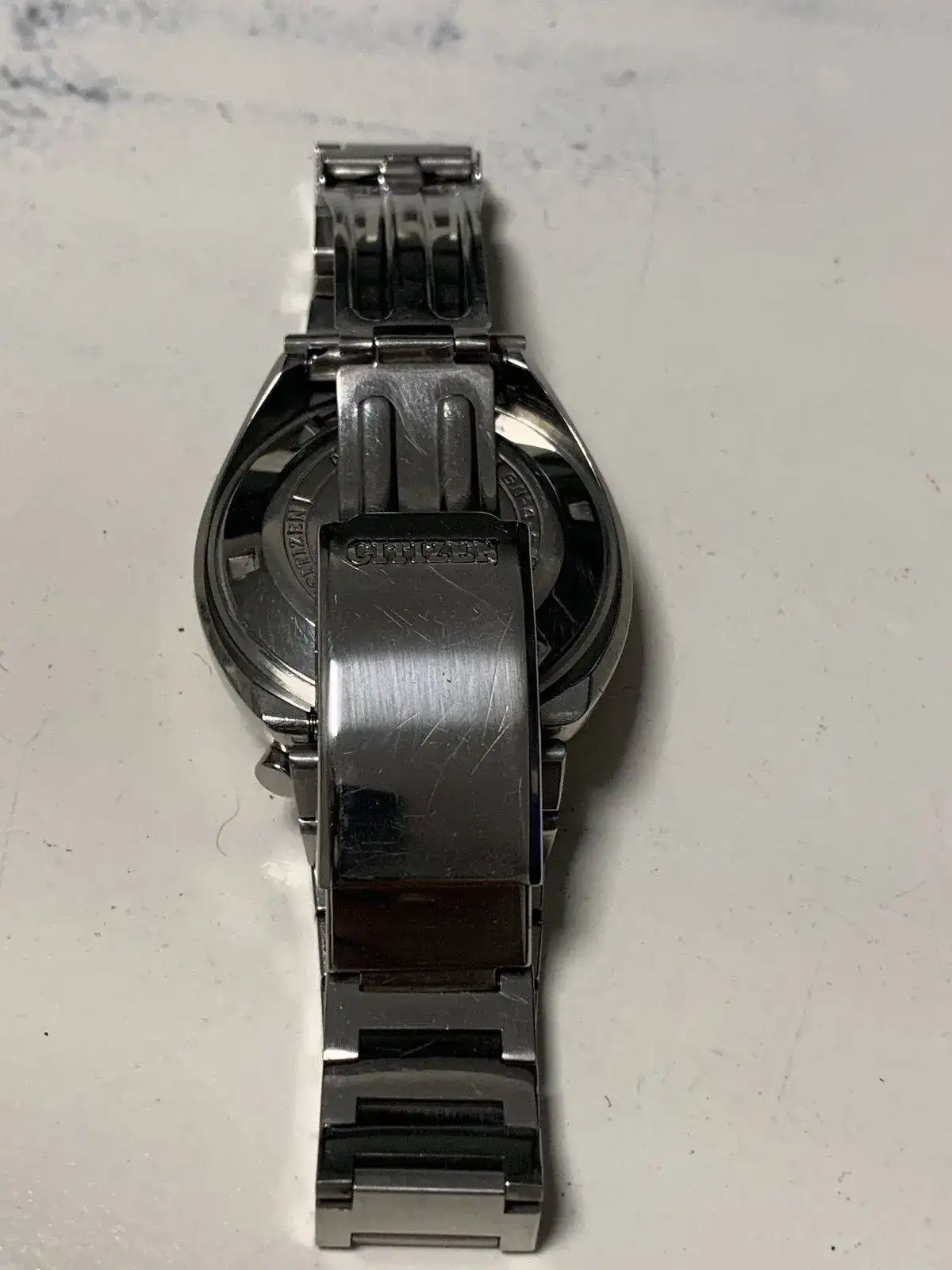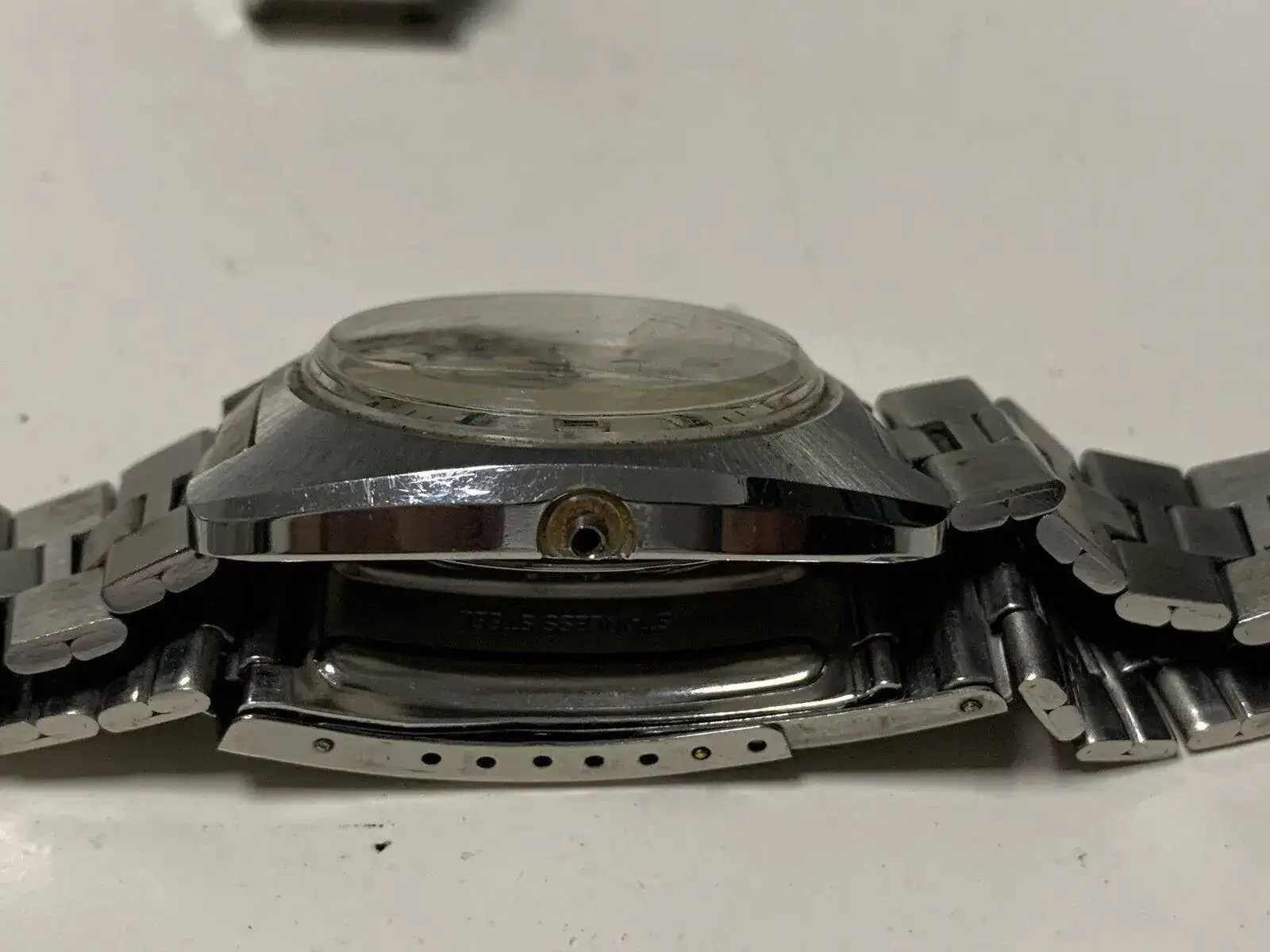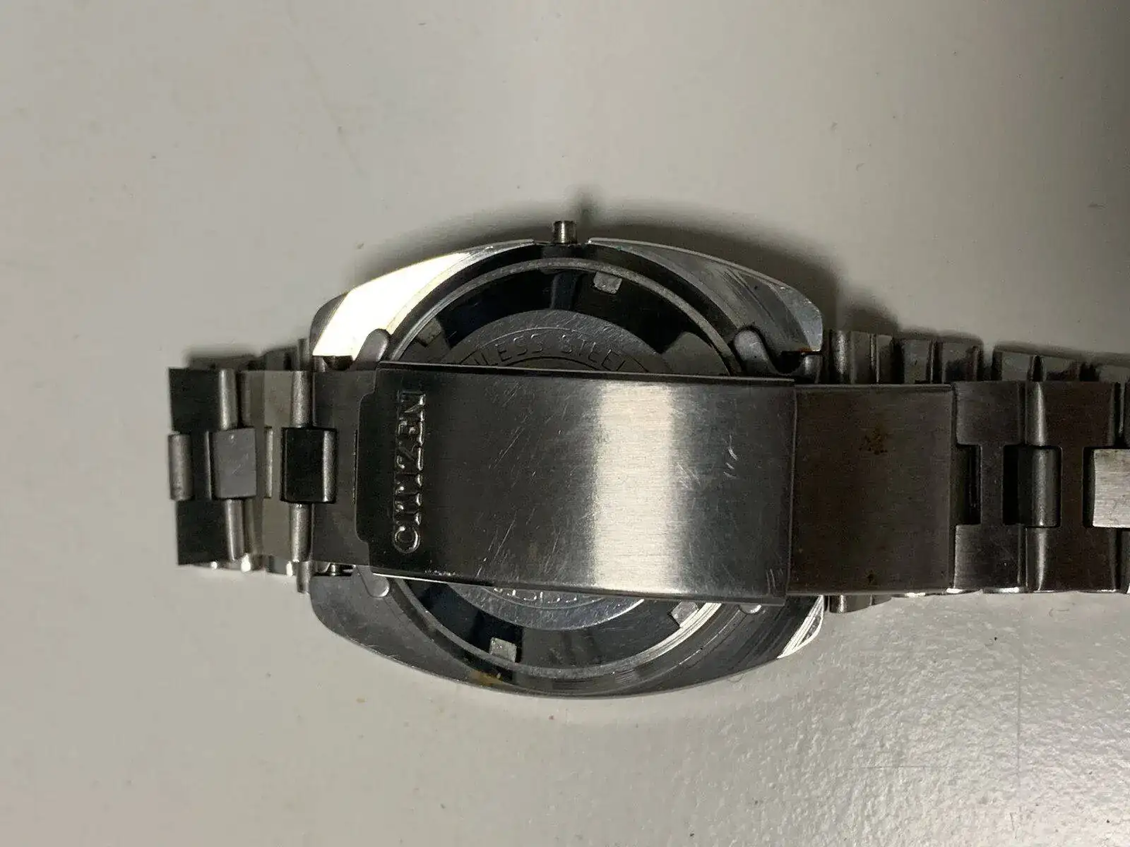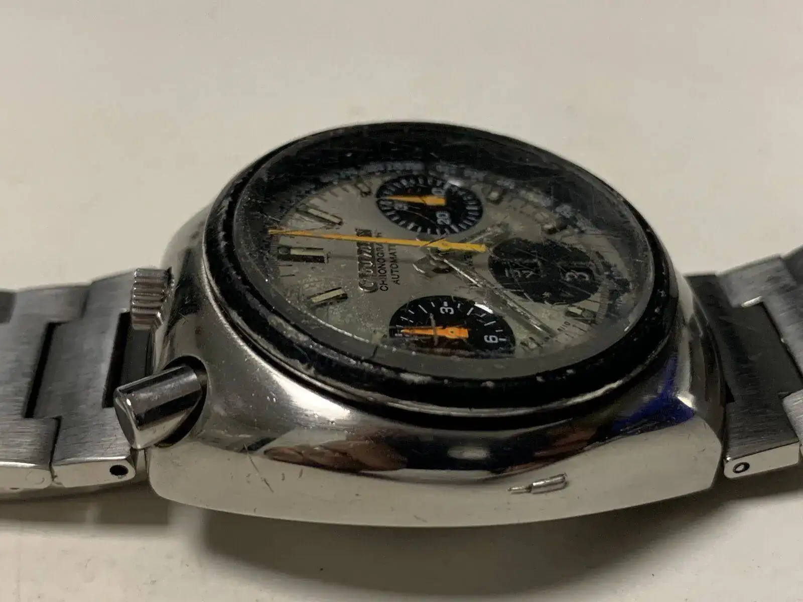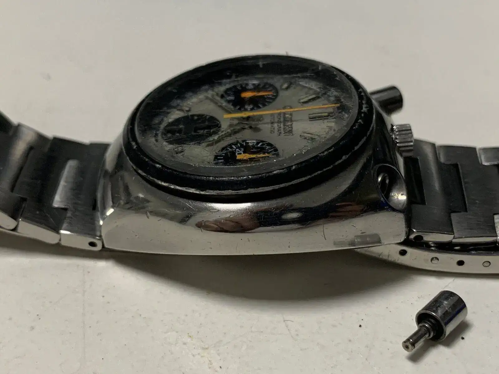 Otro es el Citizen 4-901053 conocido como Bullhead. Al darle cuerda o mover el contrapeso funciona, pero no he comprobado nada más pues ha estado muchísimos años parado en un cajón. El pulsador derecho del crono se me salió al abrirlo para las fotos. Por lo que vi se rompió una pequeña tórica que lleva en el extremo. Creo que eso es de fácil arreglo. El armis también parece el original. Para este reloj he visto varias esferas y cristales en venta en eBay y me planteé muchas veces restáurarlo, pero como ya he dicho se que no lo usaría, así que he preferido ponerlo en venta y que sea otro el que lo disfrute.
