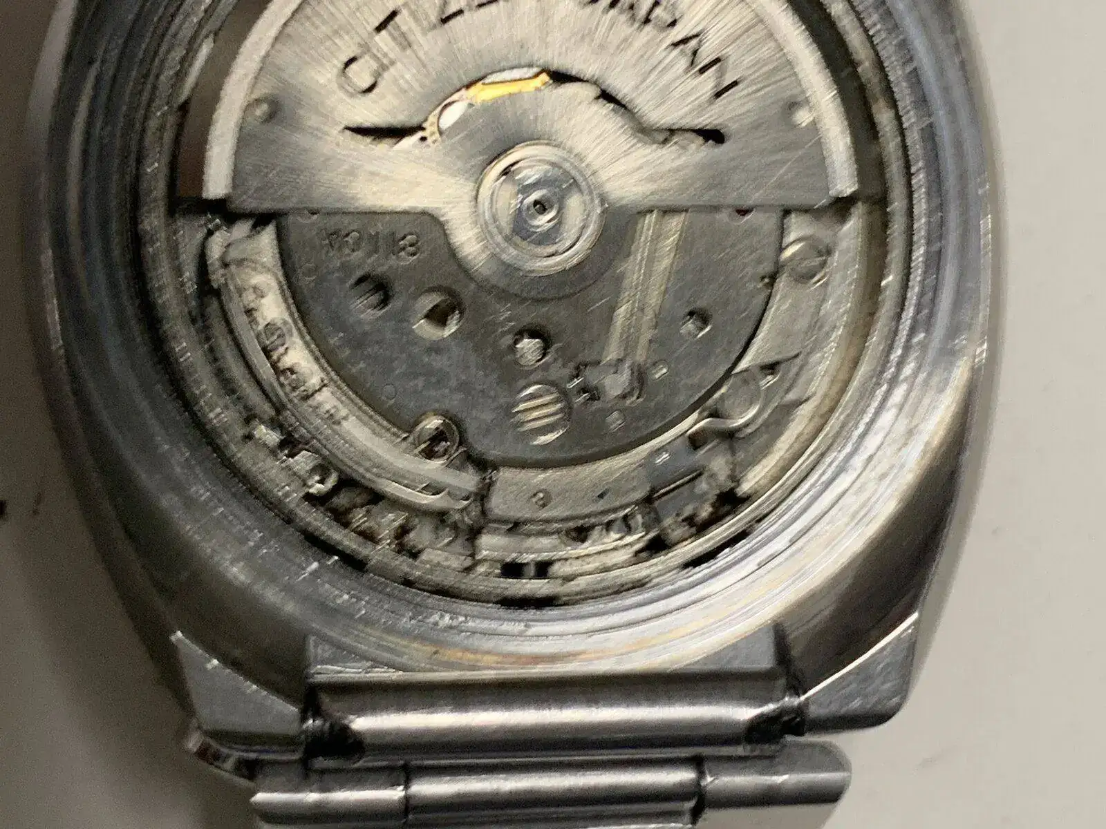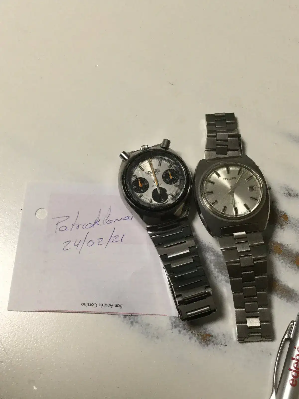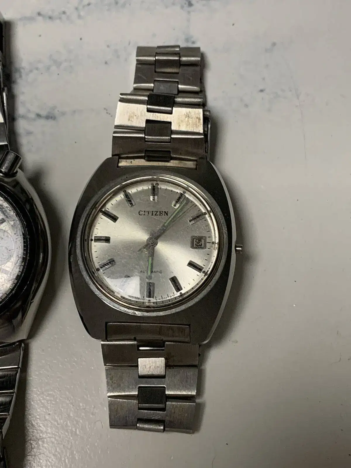 Uno es el Citizen mod. 4-820924. Le falta la corona y al quitarle la tapa parece que muestra un poco de oxido en la zona por donde entraba la tija. No le he hecho nada Y parece no funcionar ni tan siquiera moviendo el contrapeso. El armis parece el original.