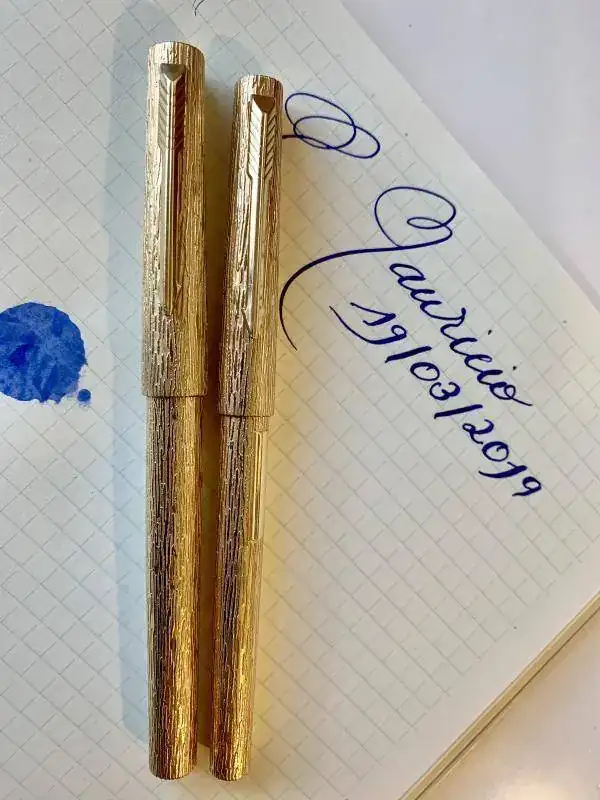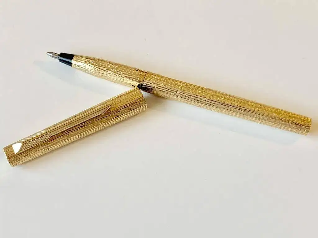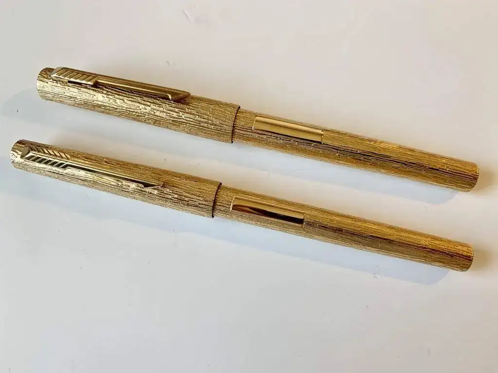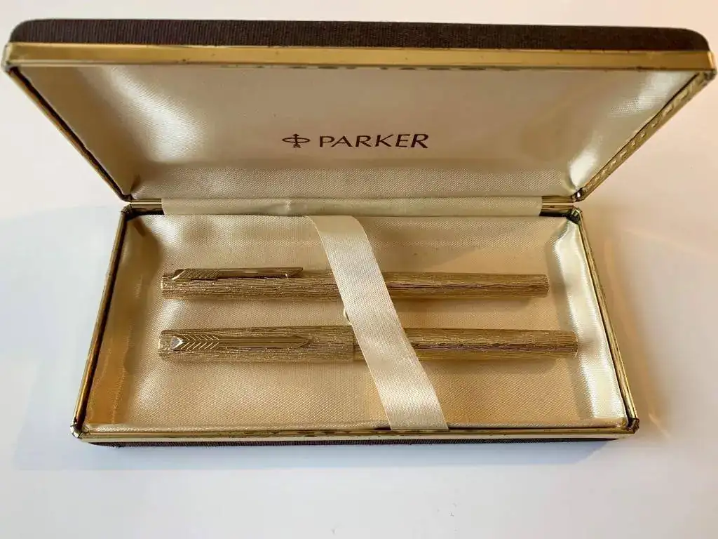 Saco a la venta conjunto de pluma y boli Parker modelo 105 acabado chapados en oro, usados pero en muy buenas condiciones dado los años que tienen.